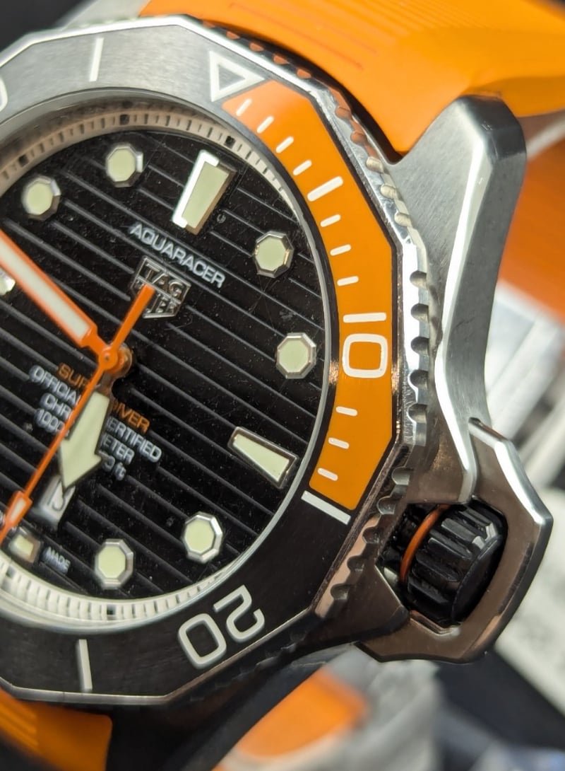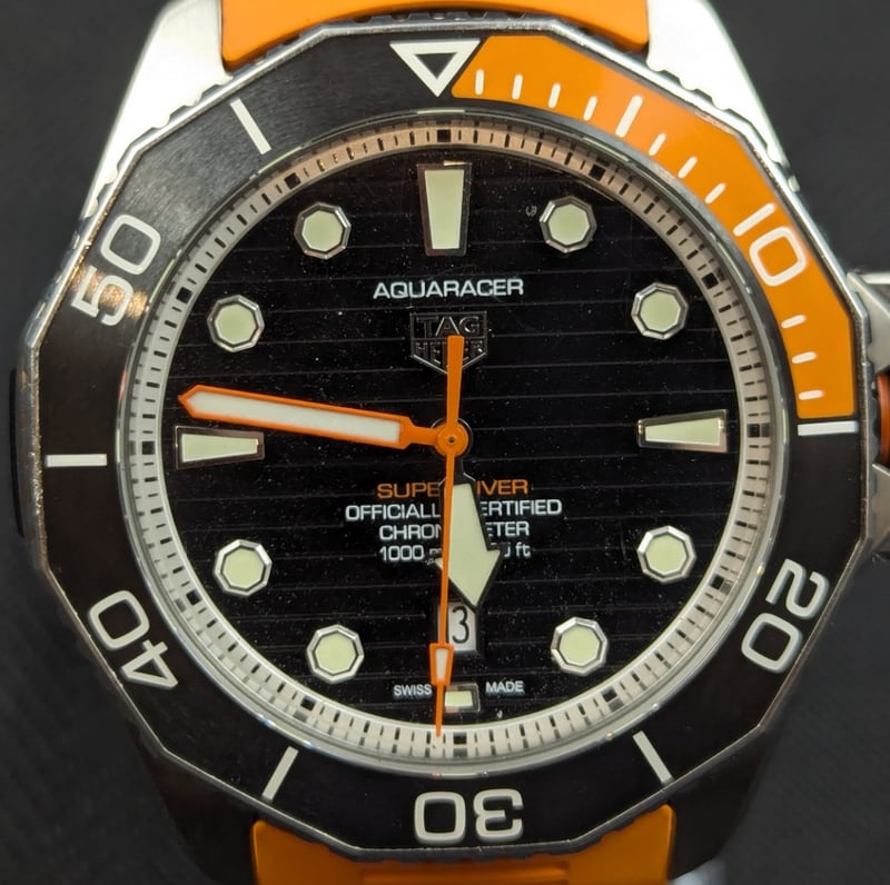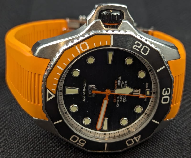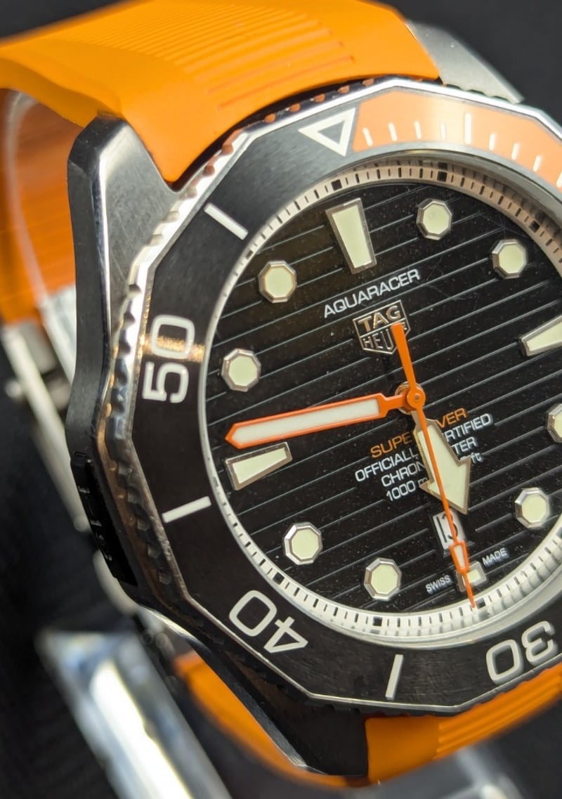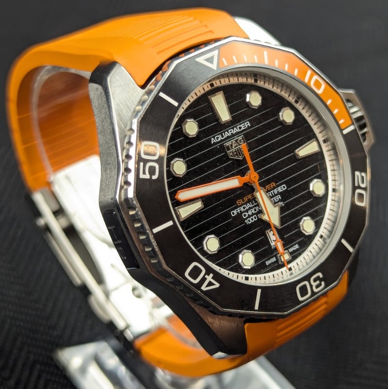 TAG HEUER AQUARACER PROFESSIONAL 1000 SUPER DIVERPRODUCTION YEAR: 2021DIAL: BLACK DIALCASE SIZE: 45MMBRACELET: ORANGE RUBBERMOVEMENT: AUTOMATICCondition: Good - Refer To ImagesAdditional Information: Non Numerical Hour MarkersDate Display At 6 O'Clock PositionFold ClaspBOX: INCLUDEDPAPERS: INCLUDEDXD587850+85