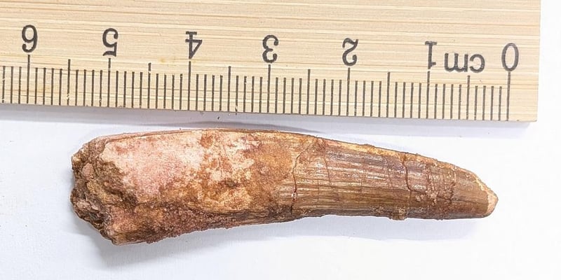 Spinosaurus Is One Of The Most Well Known Dinosaurs And Had A "Sail" On Its Back. It Is Not Known What The “Sail” Was For, But Theories Include Heat Regulation, Buoyancy In Water And Display (Both For Fighting And For Mating Purposes). It Lived For Less Than Ten Million Years Around 90 To 100 Million Years Ago In What Is Now Northern Africa. Spinosaurus Fossils Are Found In Egypt And Morocco. It Was One Of The Largest Land Carnivores And Predators That Ever Lived. Spinosaurus Was Both A Terrestrial And Marine Predator And Fish Was A Large Part Of Its Diet. In The Jurassic Park Films, Spinosaurus Is Often One Of The Feared Dinosaurs. Note That There Is A Repair On This Tooth. This Is Common And Most Spinosaurus Teeth Have Repairs Because The Tooth Is Much Softer Than The Surrounding Matrix And Is Very Difficult To Cut Out.