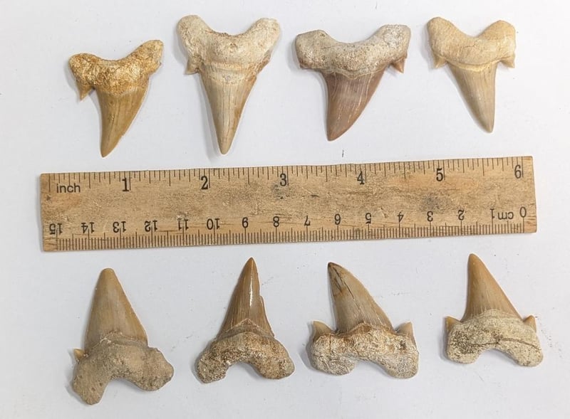 EIGHT HUGE 40 MILLION YEAR OLD FOSSIL SHARK TEETH FROM MOROCCOSpecies Is Otodus - A Large Ten Meter Shark That Was Four Times As Big As A Modern Day Great White.These Teeth Were Dug Out Of The Phosphate Mines In Morocco. The Moroccan Phosphate Fields Were Laid Down Between Roughly 93 And 33 Million Years Ago And You Often See Fossils Buried Together That Are Millions Of Years Apart. Many Kinds Of Fossils Are Found Including Shark, Stingray, Turtle, Snake, Mosasaur, Various Fish, Lizards Etc. The Moroccan Phosphate Mines Are Probably The Most Fossil Rich Area On Earth.Condition: Good - Refer Images584502+15