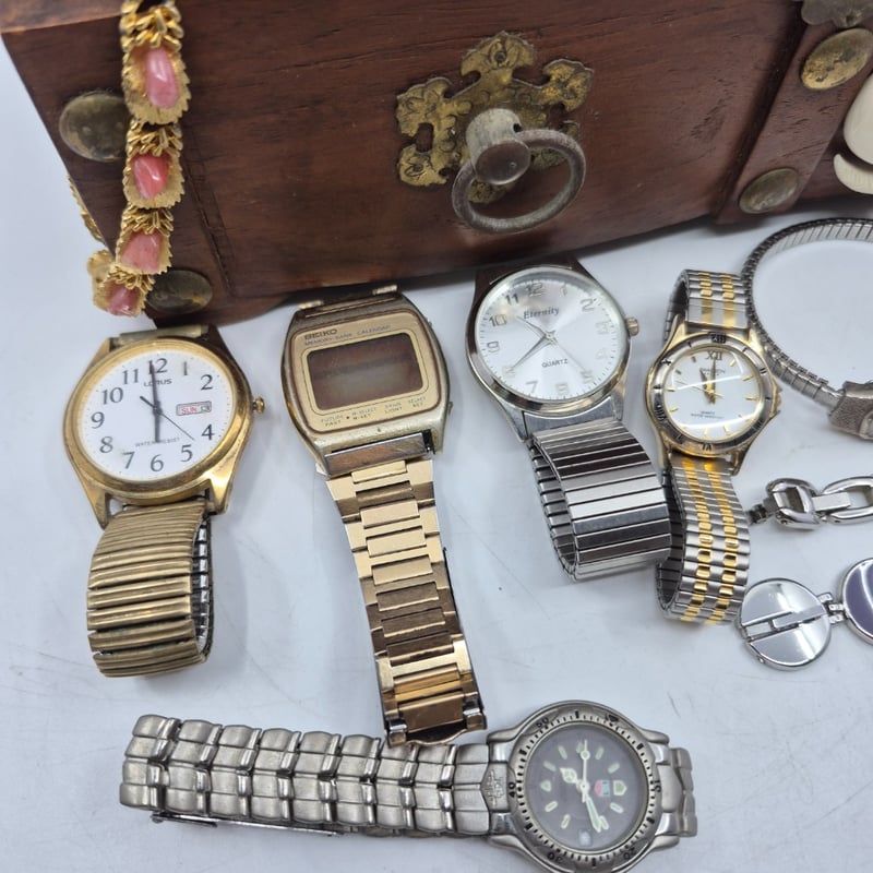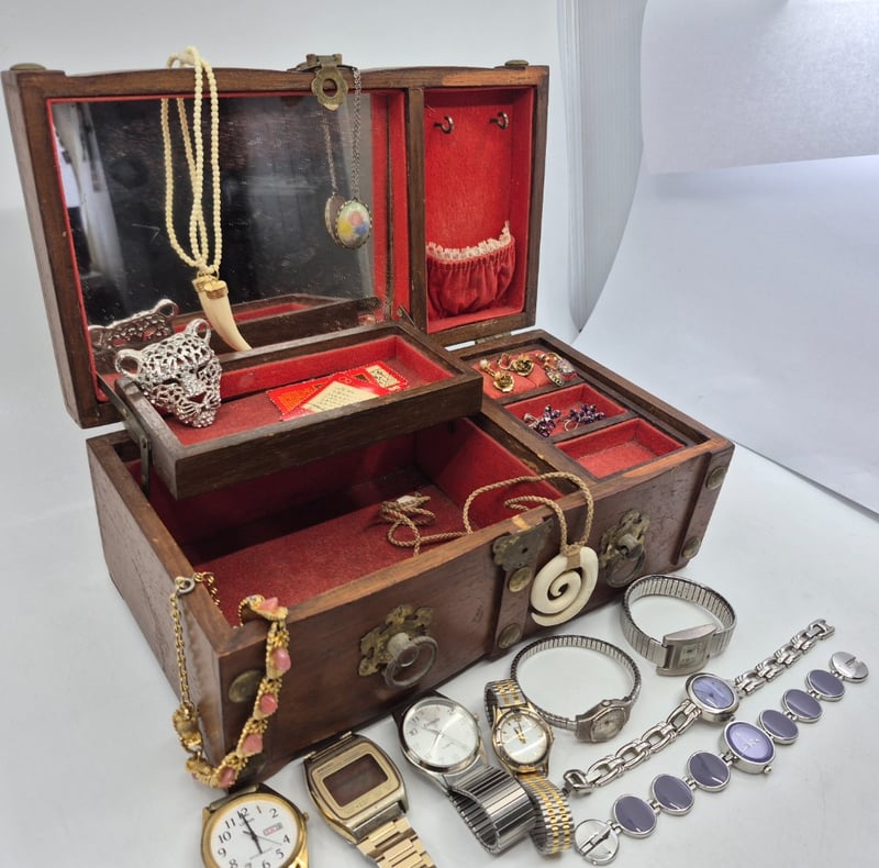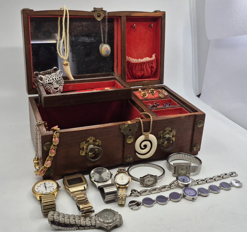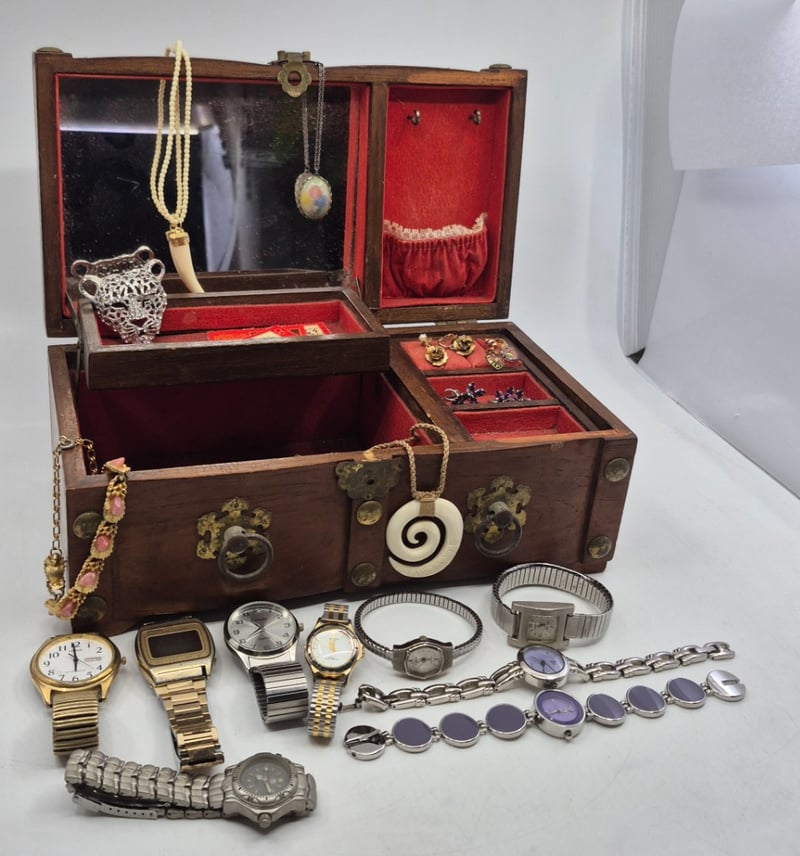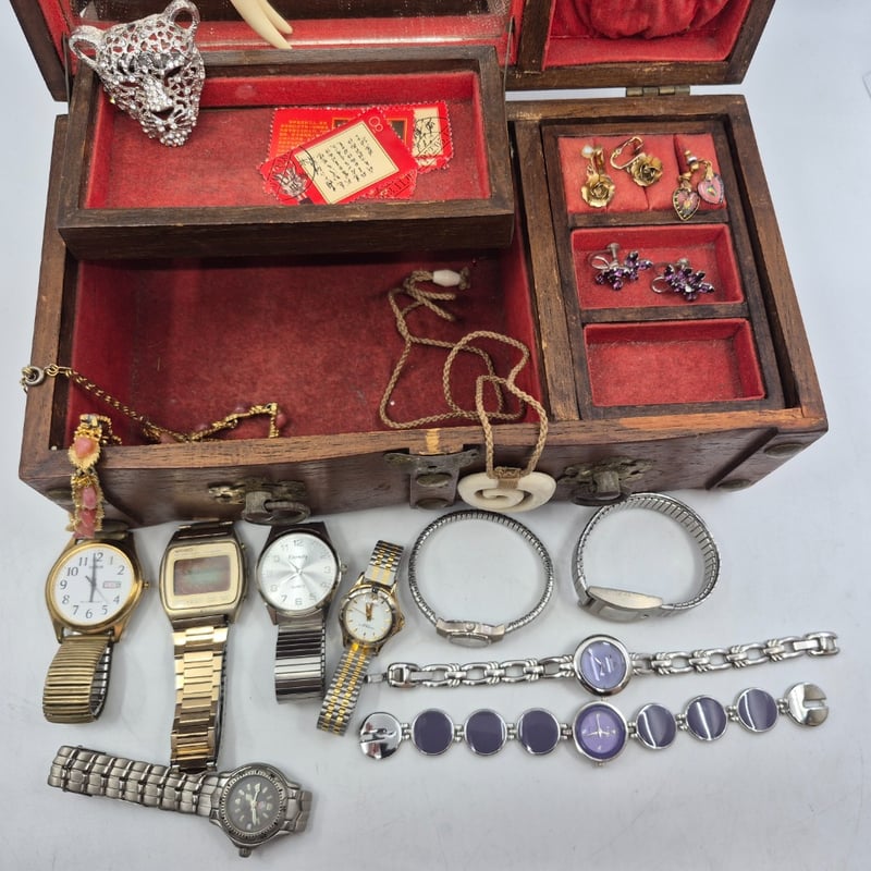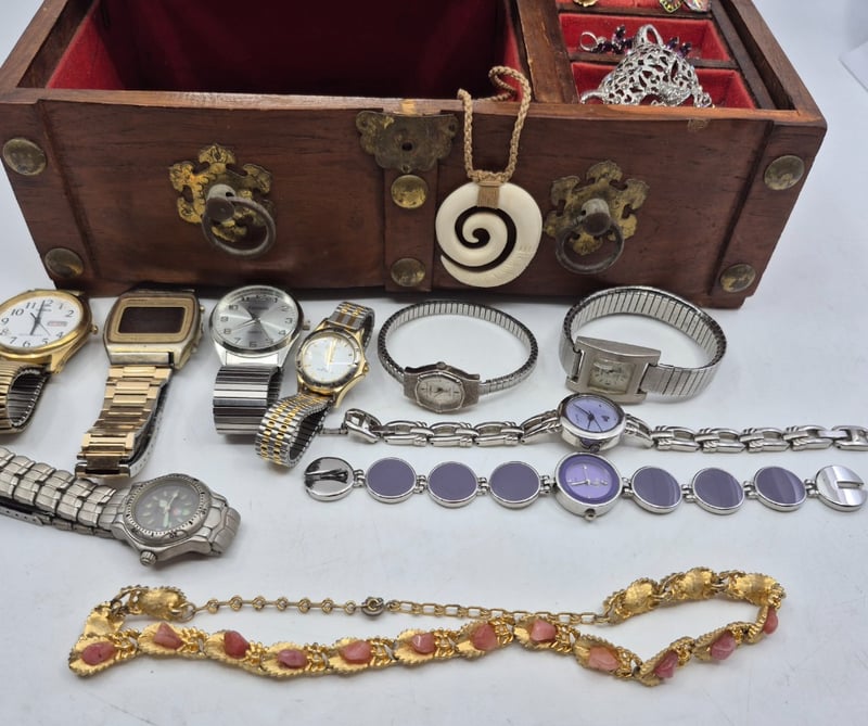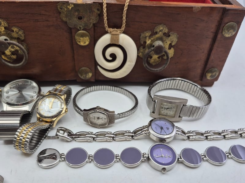 WOODEN JEWELLERY BOX INCLUDING NECKLACES, EARRINGS, WATCHES AND MOREItem Size: Height: 11cm, Width: 27.5cm, Depth: 15cmCondition: Good - Refer To Images6A587866+1