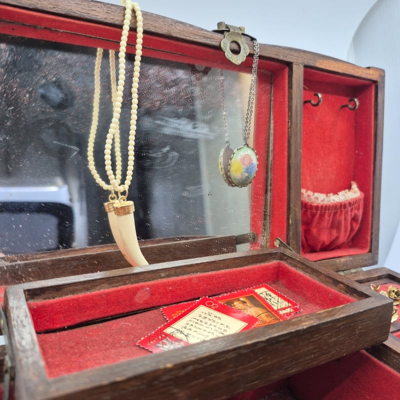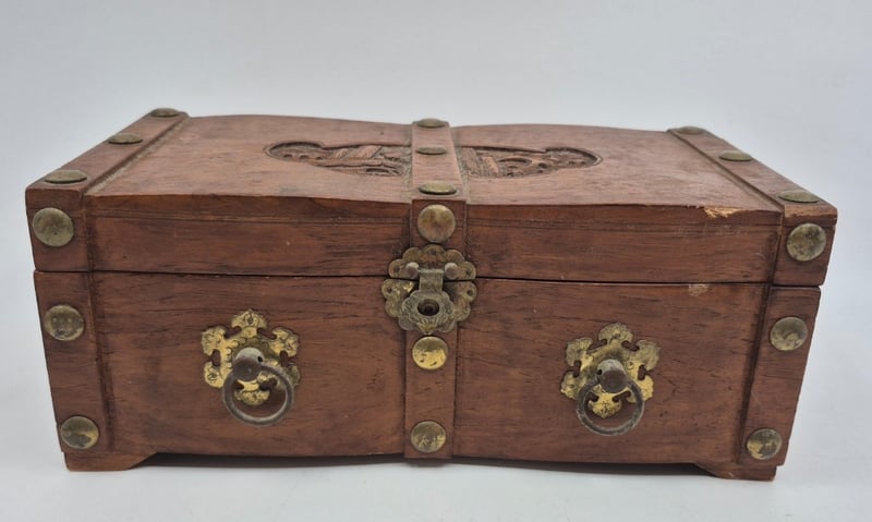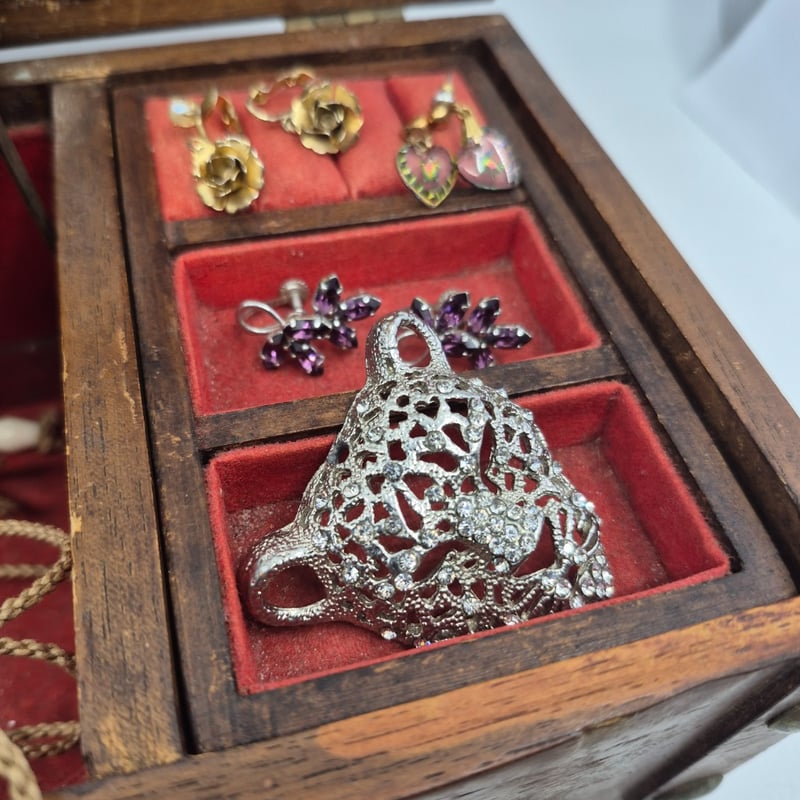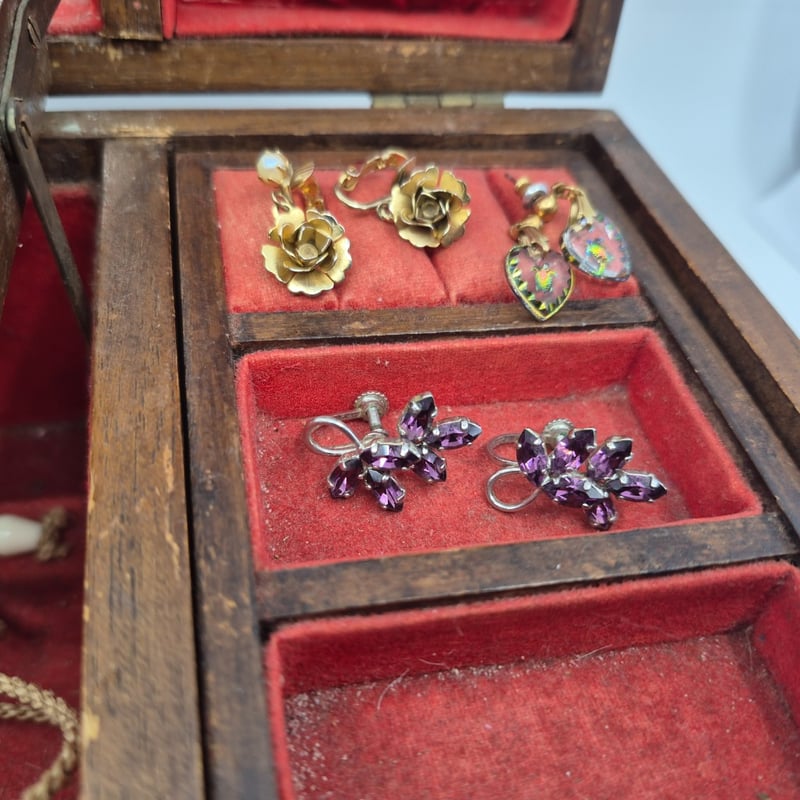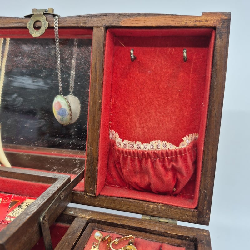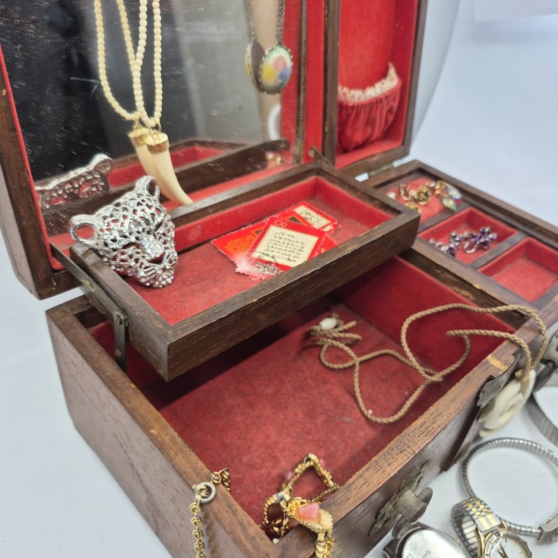 WOODEN JEWELLERY BOX INCLUDING NECKLACES, EARRINGS, WATCHES AND MOREItem Size: Height: 11cm, Width: 27.5cm, Depth: 15cmCondition: Good - Refer To Images6A587866+1