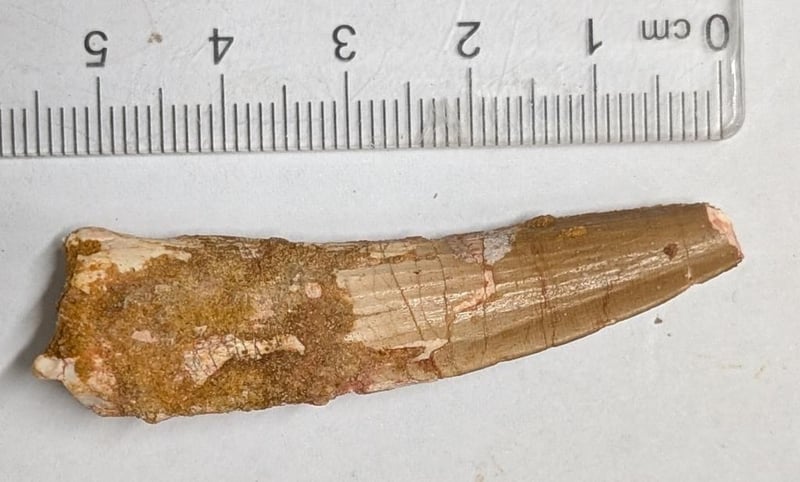 100 MILLION YEAR OLD SPINOSAURUS DINOSAUR TOOTH FOSSIL FROM MOROCCO Spinosaurus Is One Of The Most Well Known Dinosaurs And Had A "Sail" On Its Back. It Is Not Known What The “Sail” Was For, But Theories Include Heat Regulation, Buoyancy In Water And Display (Both For Fighting And For Mating Purposes). It Lived For Less Than Ten Million Years Around 90 To 100 Million Years Ago In What Is Now Northern Africa. Spinosaurus Fossils Are Found In Egypt And Morocco. It Was One Of The Largest Land Carnivores And Predators That Ever Lived. Spinosaurus Was Both A Terrestrial And Marine Predator And Fish Was A Large Part Of Its Diet. In The Jurassic Park Films, Spinosaurus Is Often One Of The Feared Dinosaurs. Note That There Is A Repair On This Tooth. This Is Common And Most Spinosaurus Teeth Have Repairs Because The Tooth Is Much Softer Than The Surrounding Matrix And Is Very Difficult To Cut Out. Condition: Good - Refer Images 0585084+22