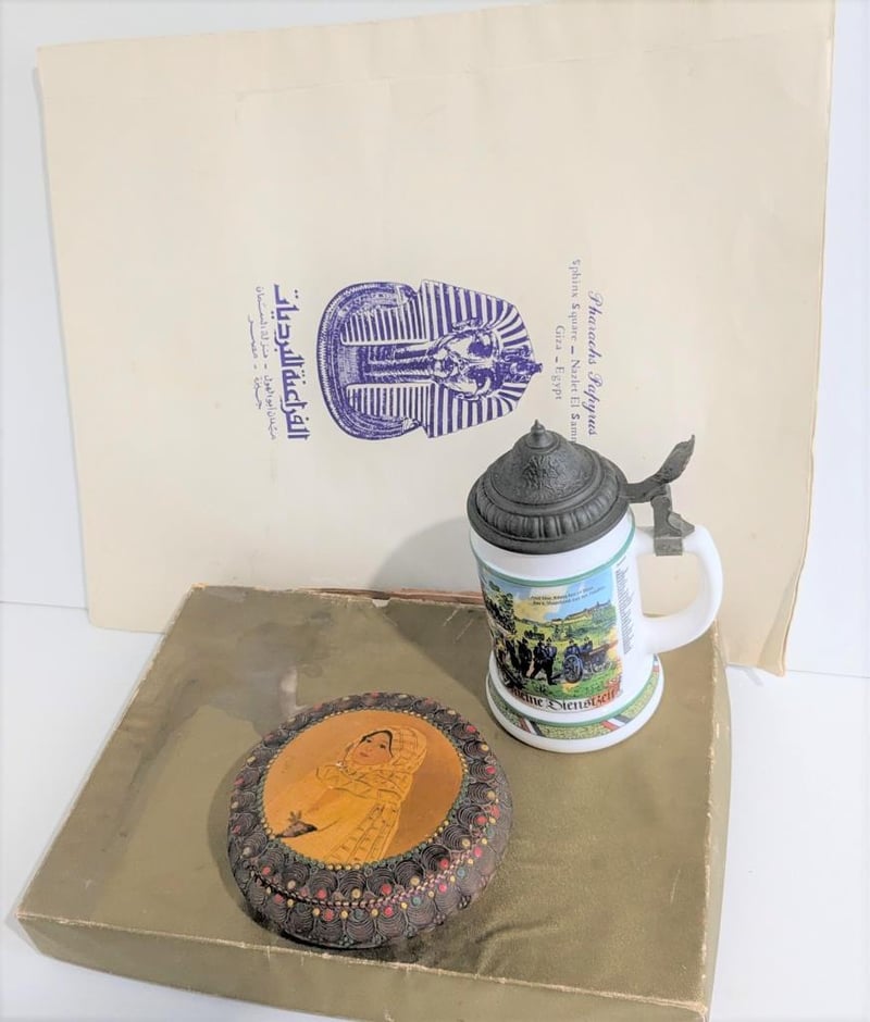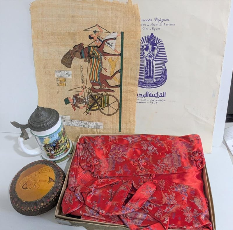 Incl Egyptian Papyrus, German Stein, Romanian Lidded Bowl & Chinese Satin Pyjamas