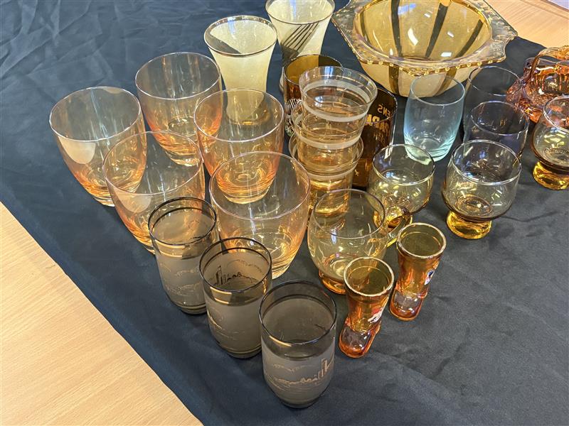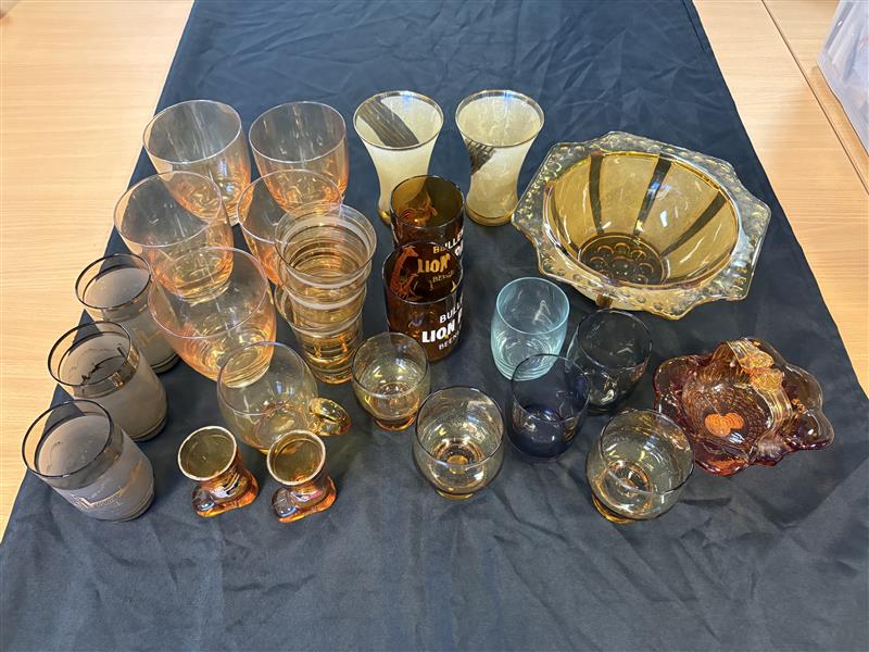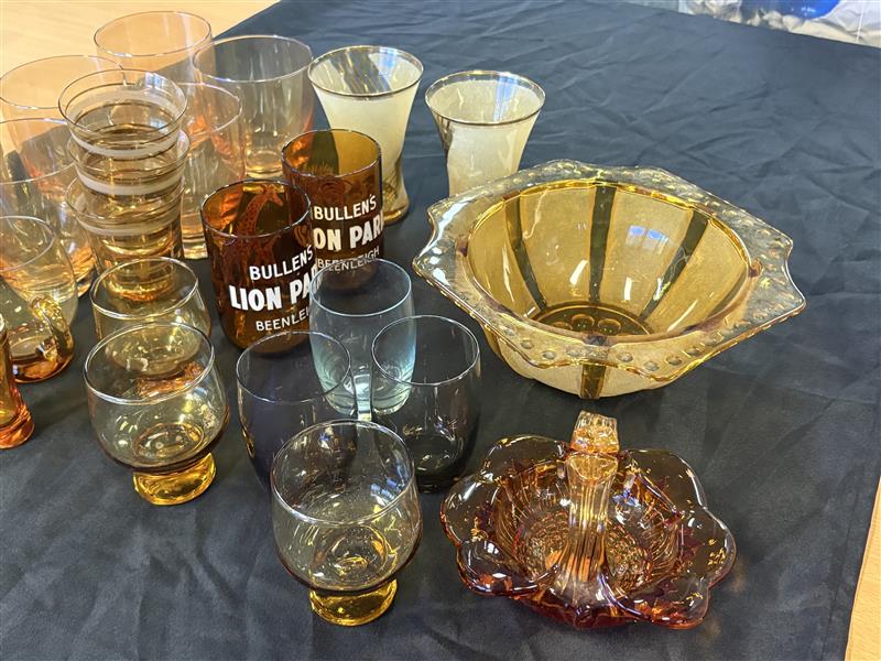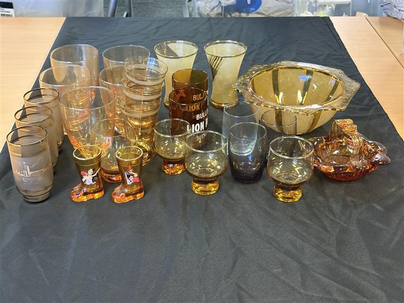 ASSORTED AMBER STYLE GLASSWARE COLLECTIONMixed Lot Of Assorted Glassware Including A Variety Of Drinking Glasses, Tumblers, Novelty Shot Glasses And Decorative Serving Pieces.Includes Multiple Sizes And Styles In Amber, Smoke And Clear Tones, Along With Decorative Bowls And Vases. Some Pieces Feature Printed Branding And Character Designs.Condition: Good - Refer To ImagesSR233546+1