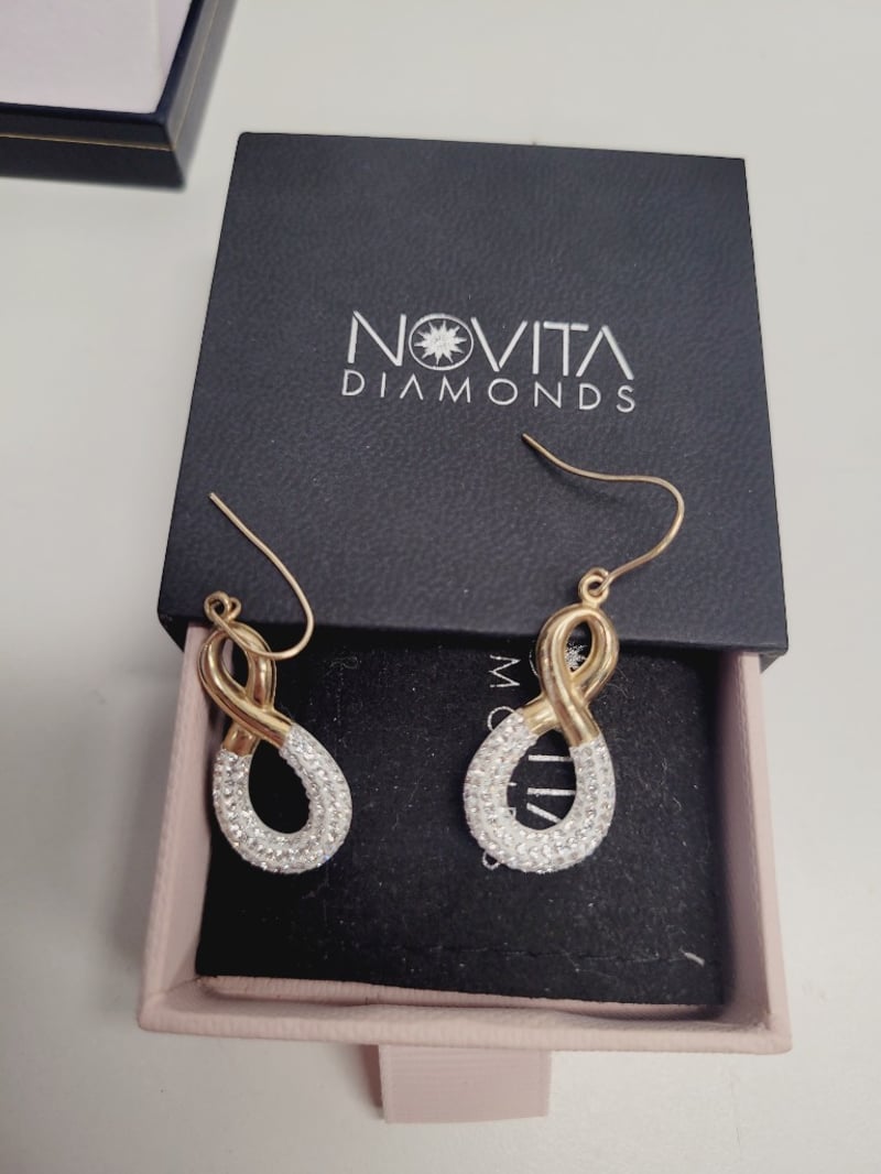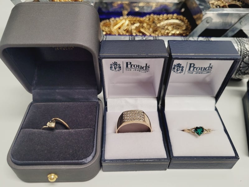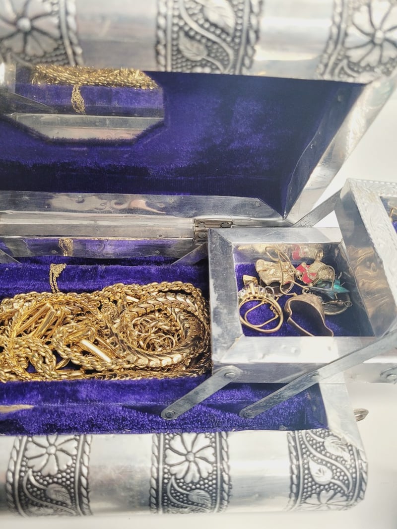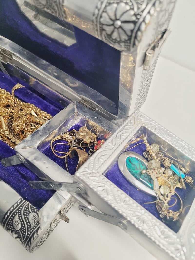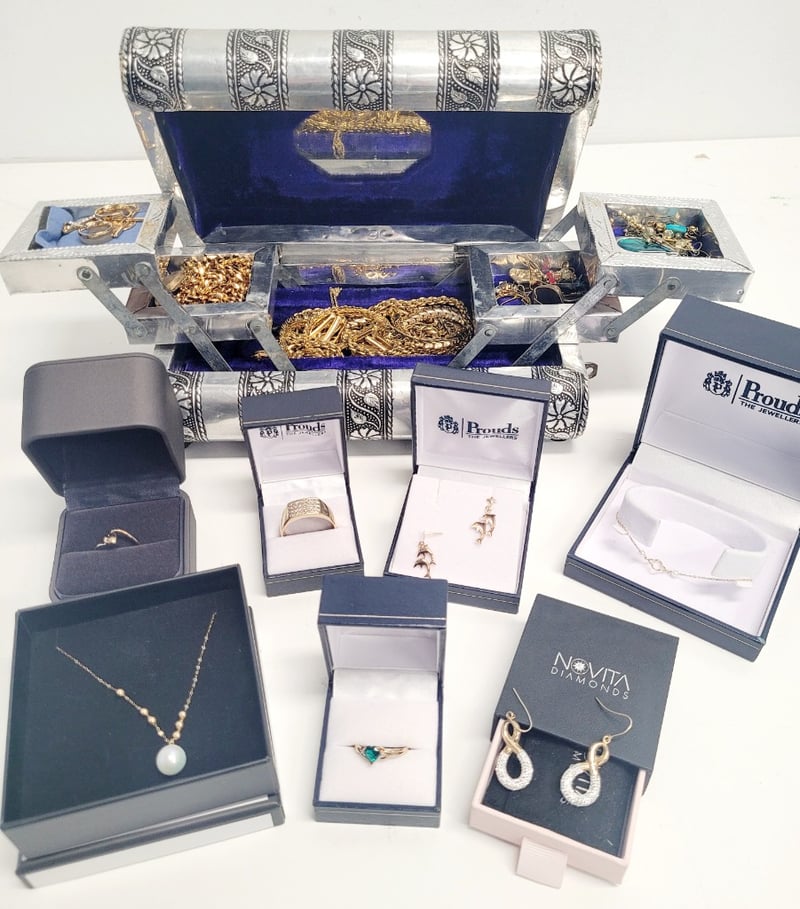 JEWELLERY BOX WITH ASSORTED RINGS , CHAINS , EARRINGS