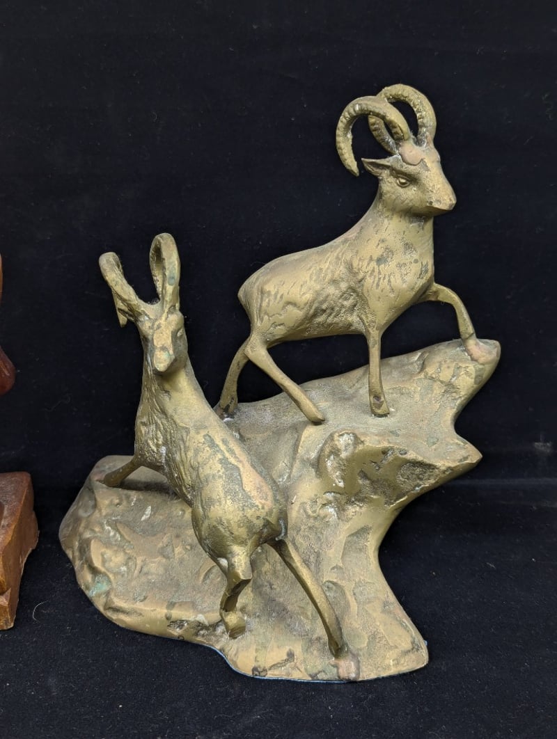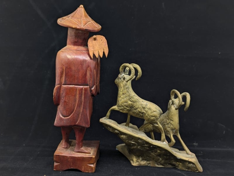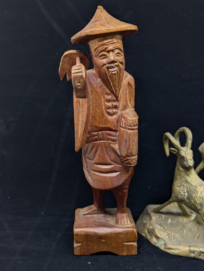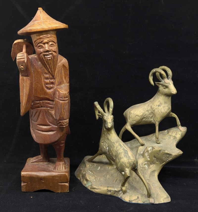 BRONZE GOAT STATUE AND TIMBER CHINESE FARMER FIGUREBronze Statue Featuring Two Goats On Rocks, Statue Size Approx: 18Cm H X 17Cm W X 17Cm D,Timber Statue Features Chinese Farmer Style Design, Size: 27Cm H X 7Cm W X 7Cm DCondition: Good - Refer To Images9B587862+3