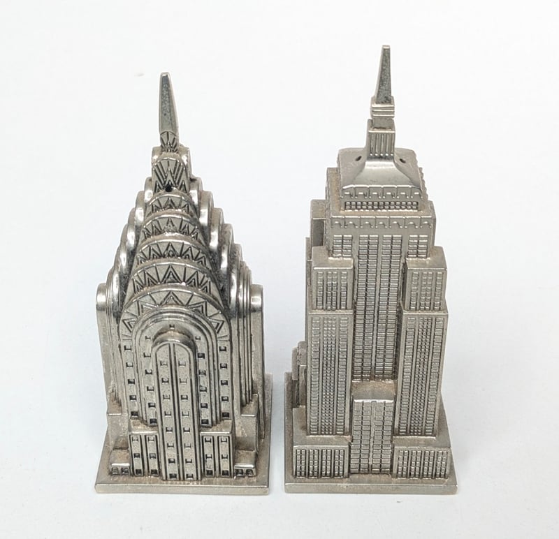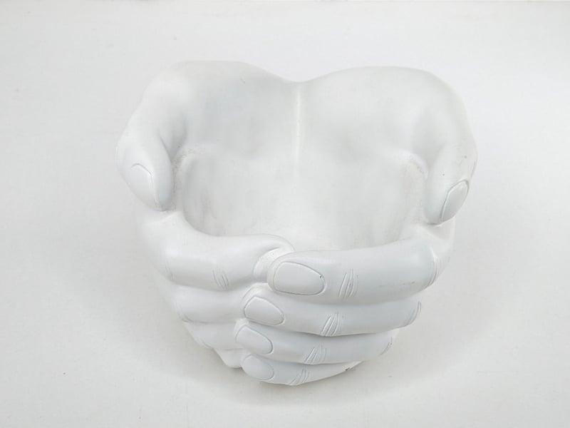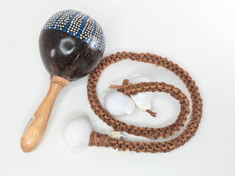 Including A Pair Of Coconut Shell Maracas With Hand-Painted Blue And White Designs, A Small Wooden Bowl On Three Legs Containing Sea Shells And A Woven Rope, A White Plaster Dish Shaped Like Two Hands Held Together, And A Pair Of Pewter-Coloured Miniature Skyscraper Statues.