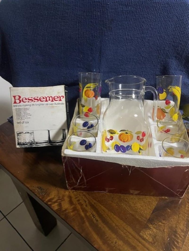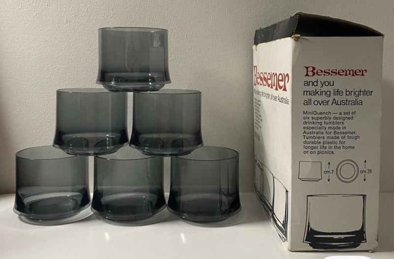 VINTAGE RETRO JUICE SET & BESSEMER SET OF 6 MINI PLASTIC TUMBLERS CIRCA 1970'S