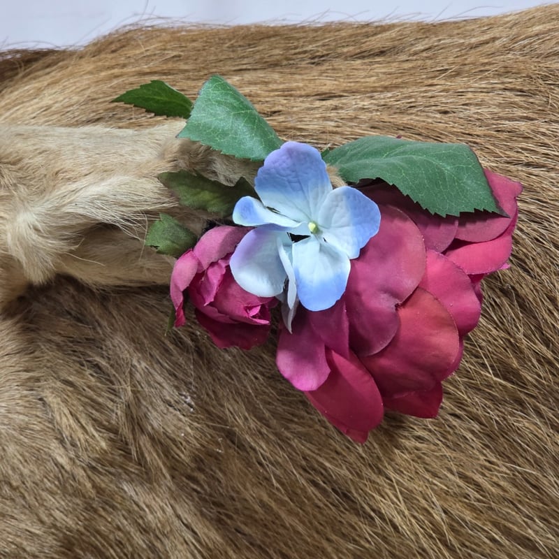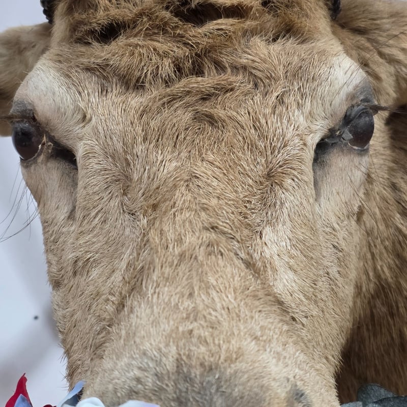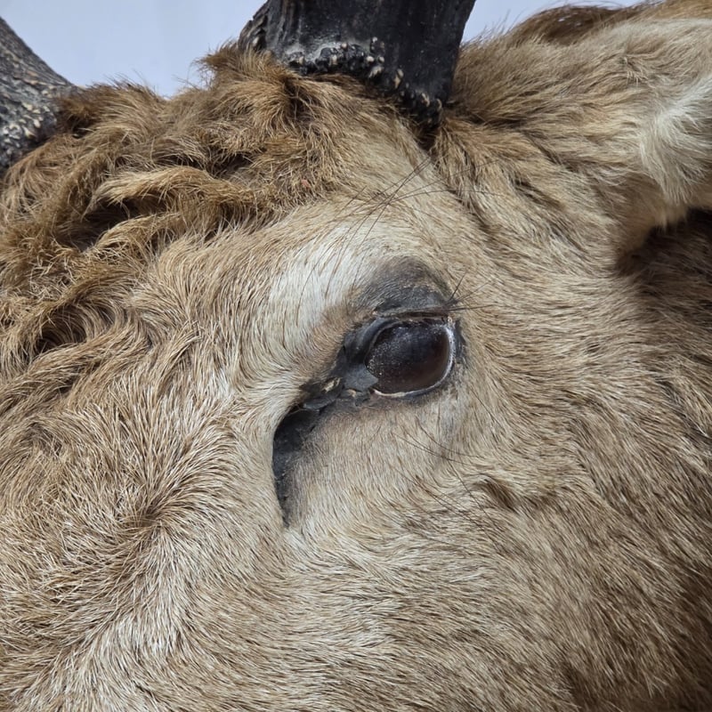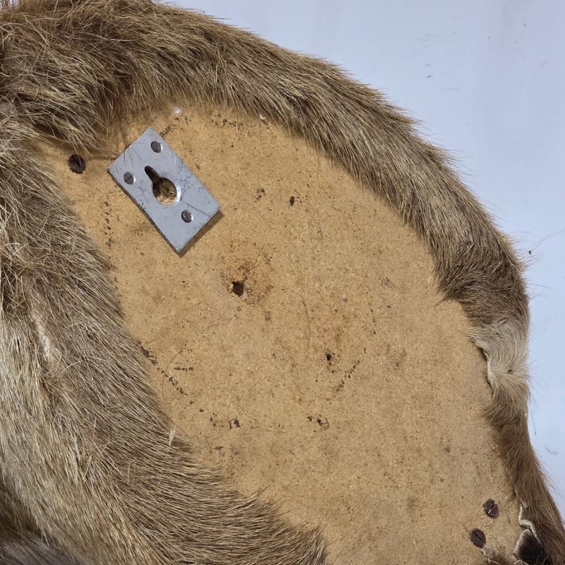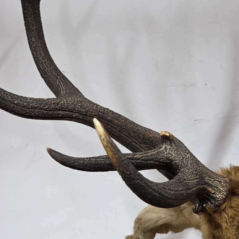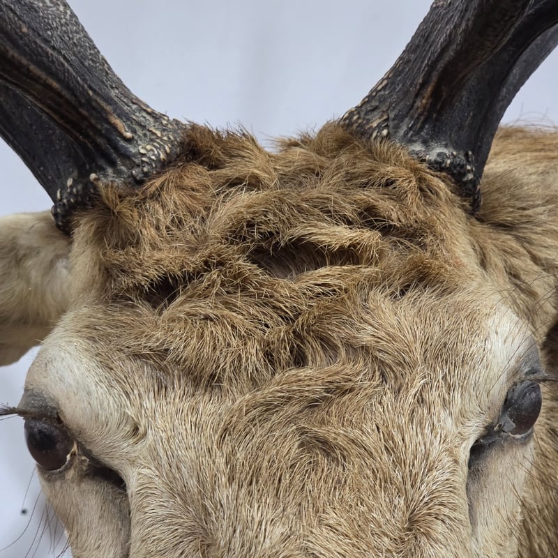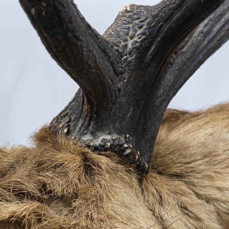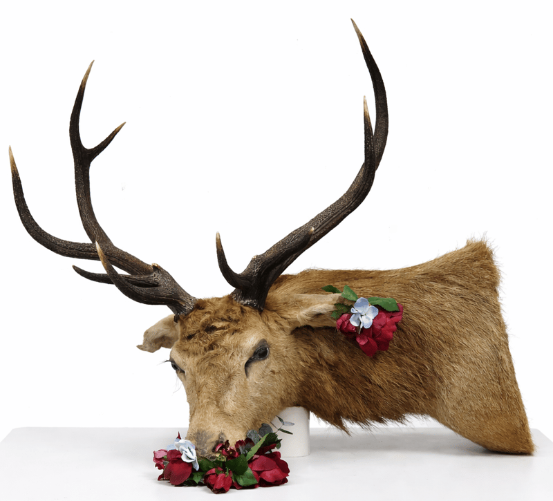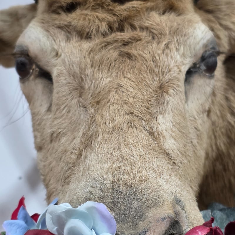 TAXIDERMY DEER HEADItem Size: Height: 95cm, Width: 67cm, Depth: 95cm, Weight: 30KgTaxidermy Deer Head, Large Multi-Point Antlers, Brown And Tan Fur, Downward Angled Head, Artificial Floral Decoration, Arrangement Of Red And Blue Artificial FlowersCondition: Good - Refer To Images232943+1