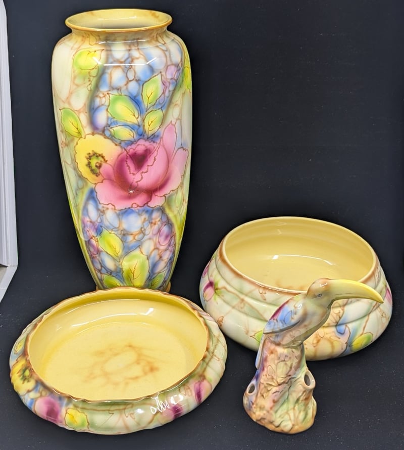 FOUR FALCON WARE DECORATIVE HOME ITEMS, 'KILLARNEY'Includes Vase, Decorative Bird, Bowls, Vase Size: 38Cm H X 16Cm WCondition: Good - Refer To Images587900+13