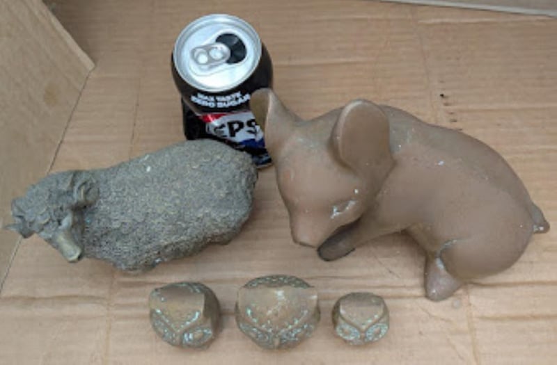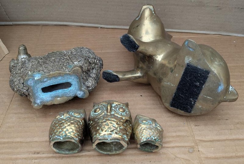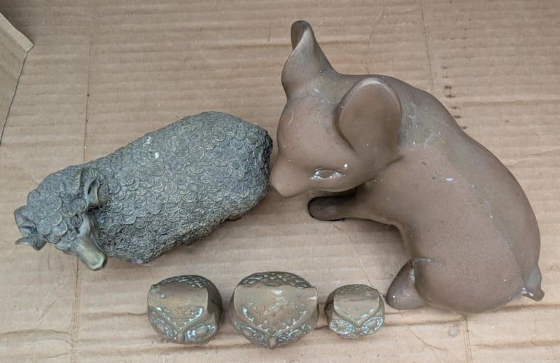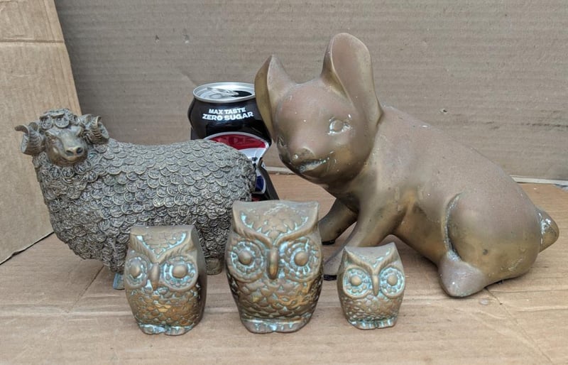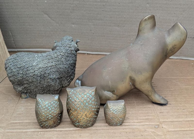 BRASS FIGURINES INCLUDE PIG, SHEEP AND 3 X OWLS