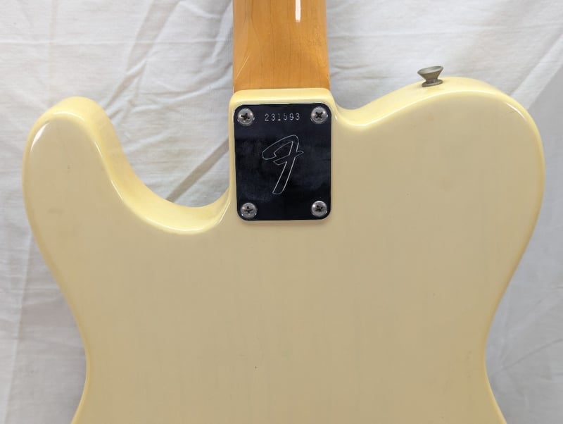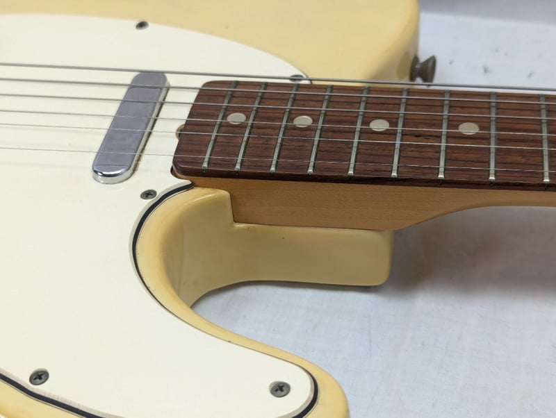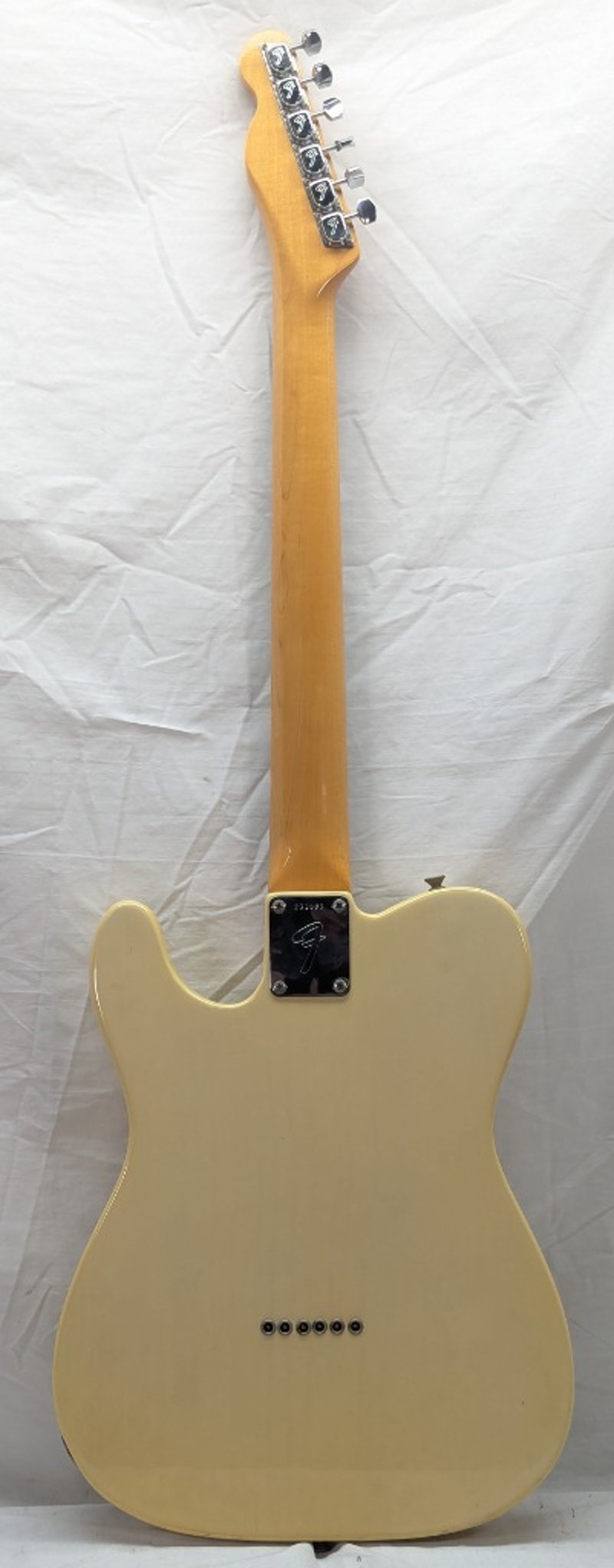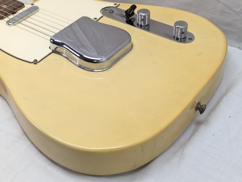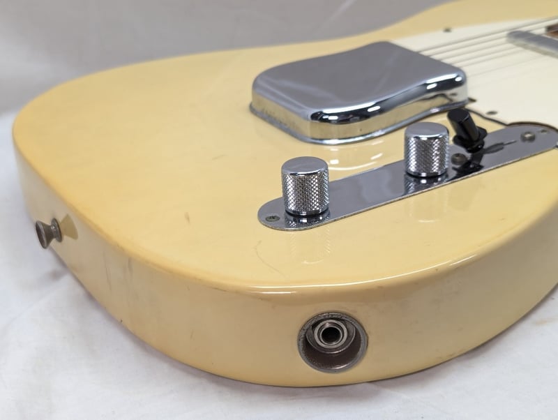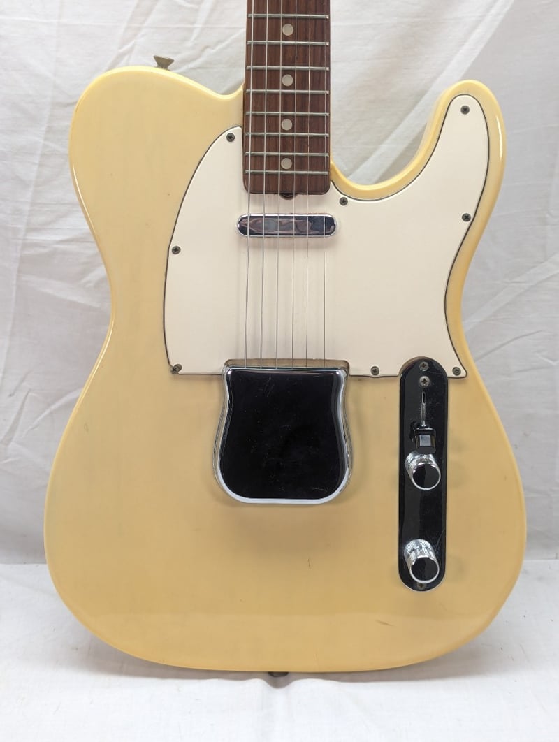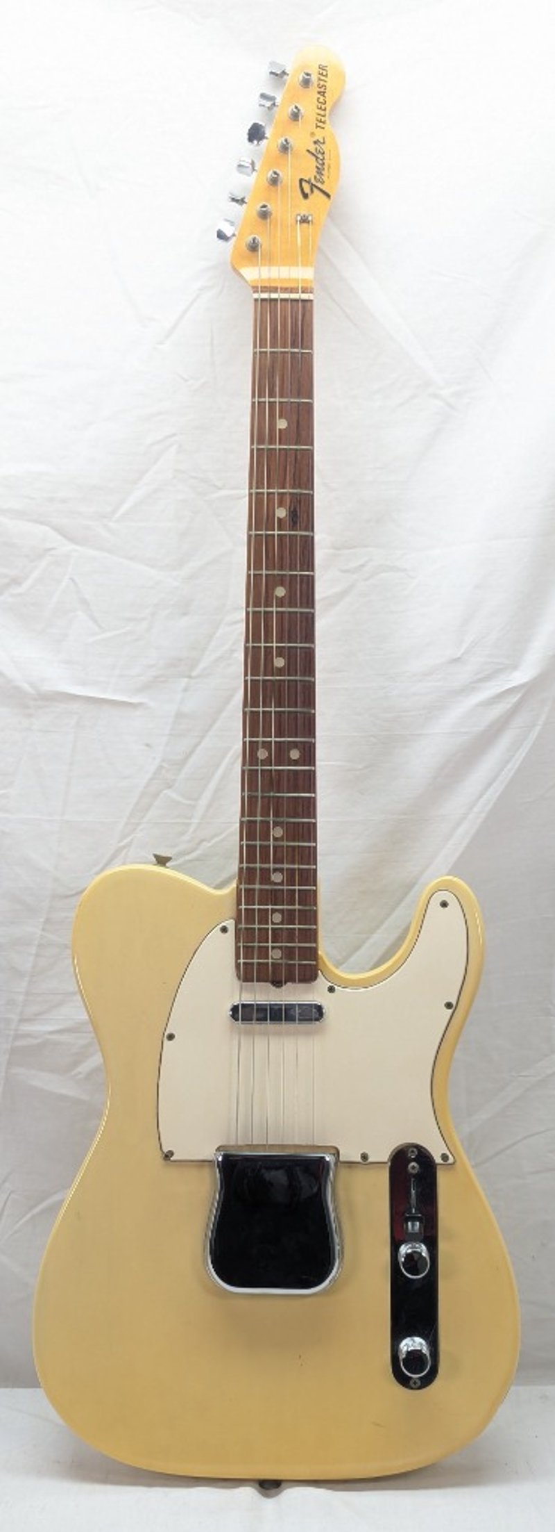 1968 Fender Telecaster in butter cream/pale yellow finish with single-coil pickup configuration. Features a solid body construction with contoured waist, maple neck with rosewood fingerboard containing pearl dot inlays, and six-in-line tuning machines. With a chrome control plate with volume and tone controls, chrome bridge assembly, and black pickguard. Includes Black hard case with blue crushed velvet interior, containing Strings, Gibson Handy Polish Kit, and leather strap. The case shows appropriate vintage patina consistent with age. Instrument exhibits light playwear consistent with use but maintains overall structural integrity and playability.