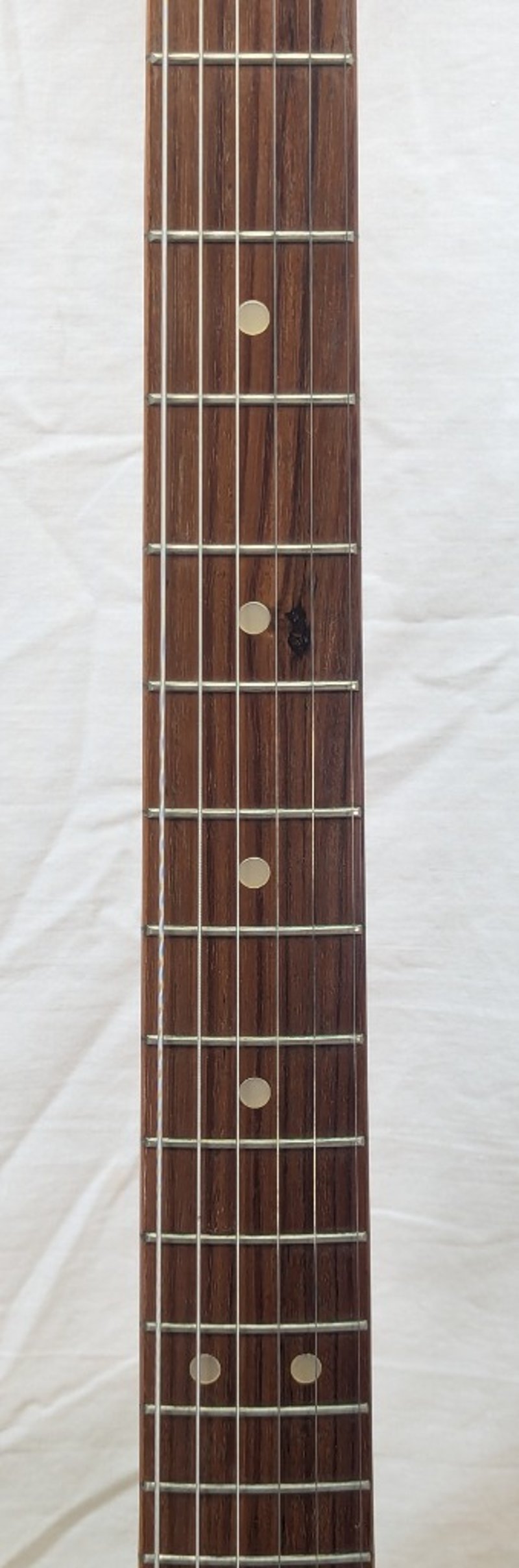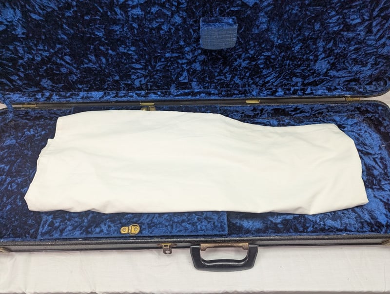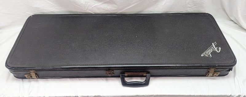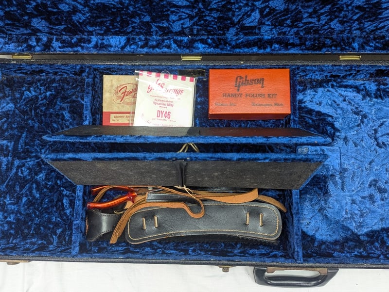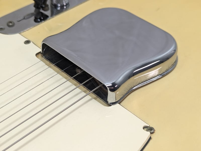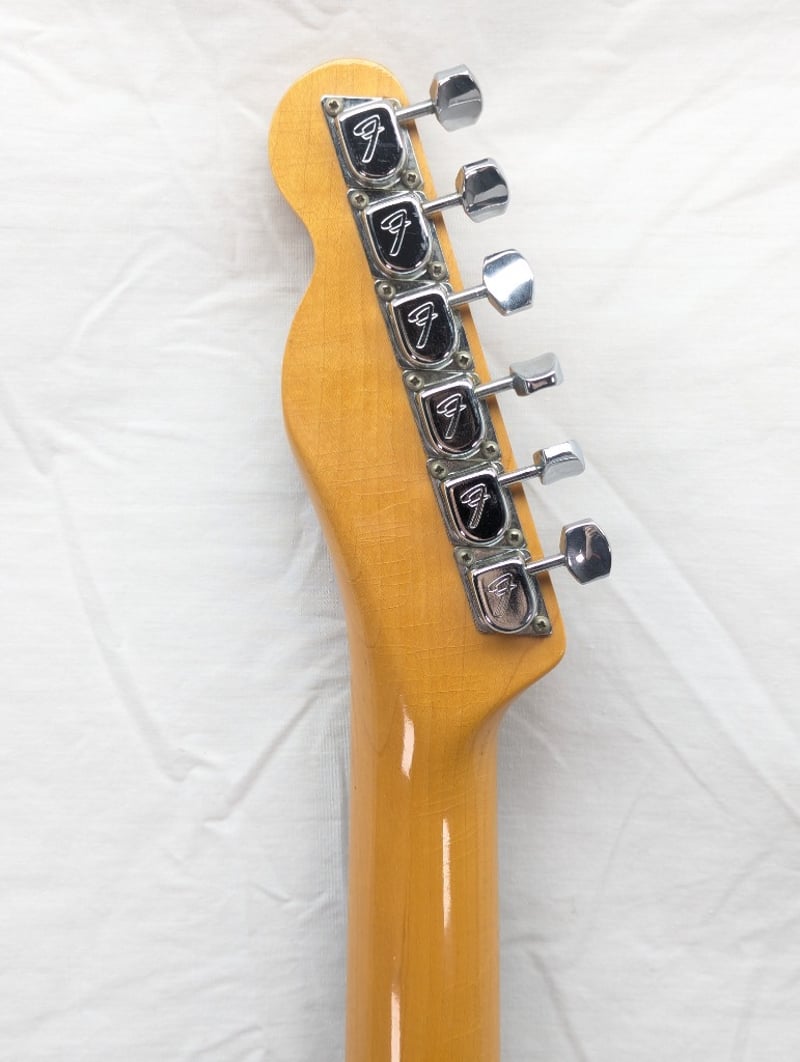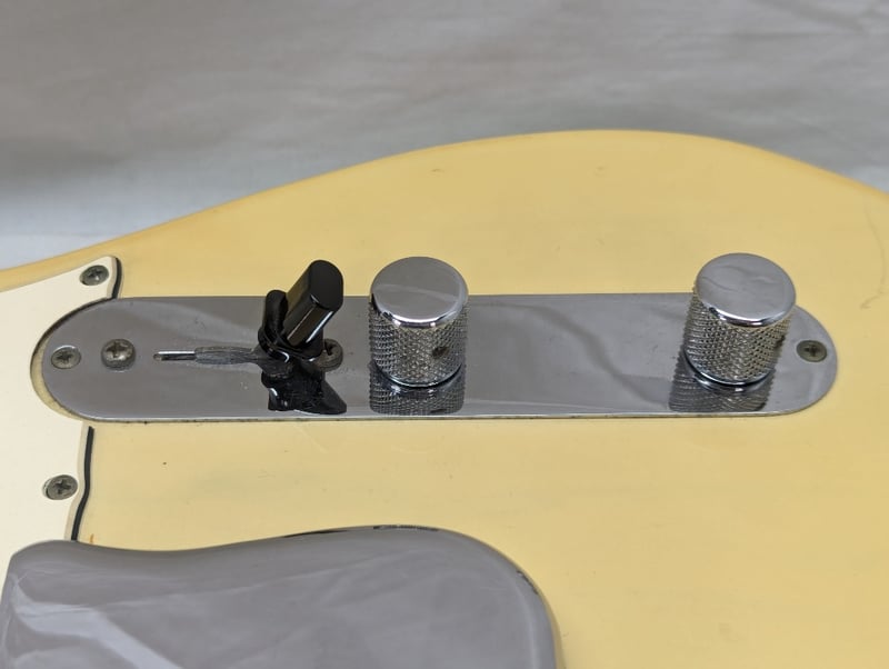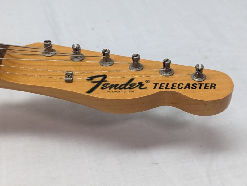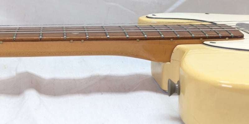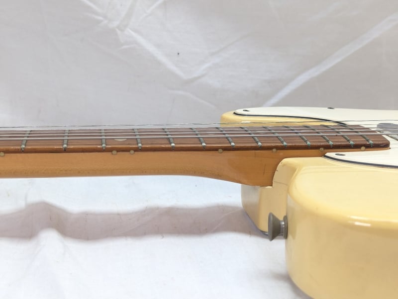 1968 Fender Telecaster in butter cream/pale yellow finish with single-coil pickup configuration. Features a solid body construction with contoured waist, maple neck with rosewood fingerboard containing pearl dot inlays, and six-in-line tuning machines. With a chrome control plate with volume and tone controls, chrome bridge assembly, and black pickguard. Includes Black hard case with blue crushed velvet interior, containing Strings, Gibson Handy Polish Kit, and leather strap. The case shows appropriate vintage patina consistent with age. Instrument exhibits light playwear consistent with use but maintains overall structural integrity and playability.