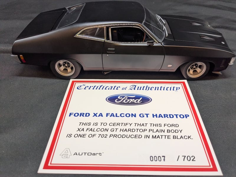 1X 1:18 AUTOART FORD XA FALCON GT HARDTOP PLAIN BODY MODEL CARItem Size: Height: 15cm, Width: 17cm, Depth: 35cm, Weight: 5KgColour: Matte BlackCertificate Of Authenticity Number: 7/702Condition: Good - Refer To ImagesACACIA RIDGE585073+16