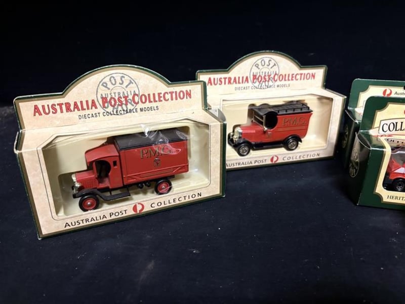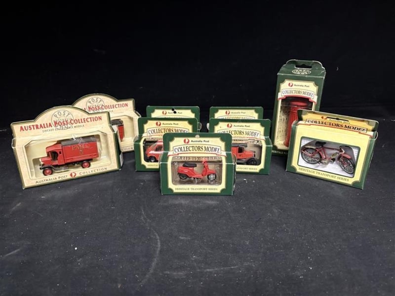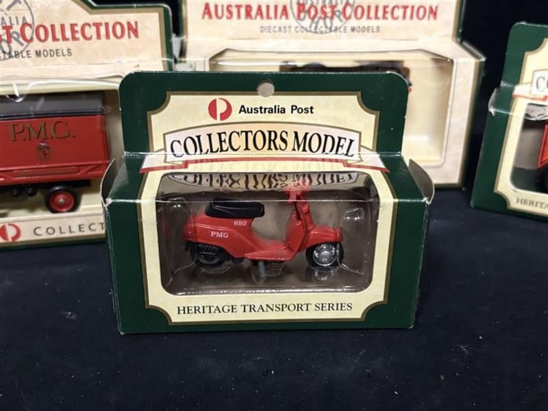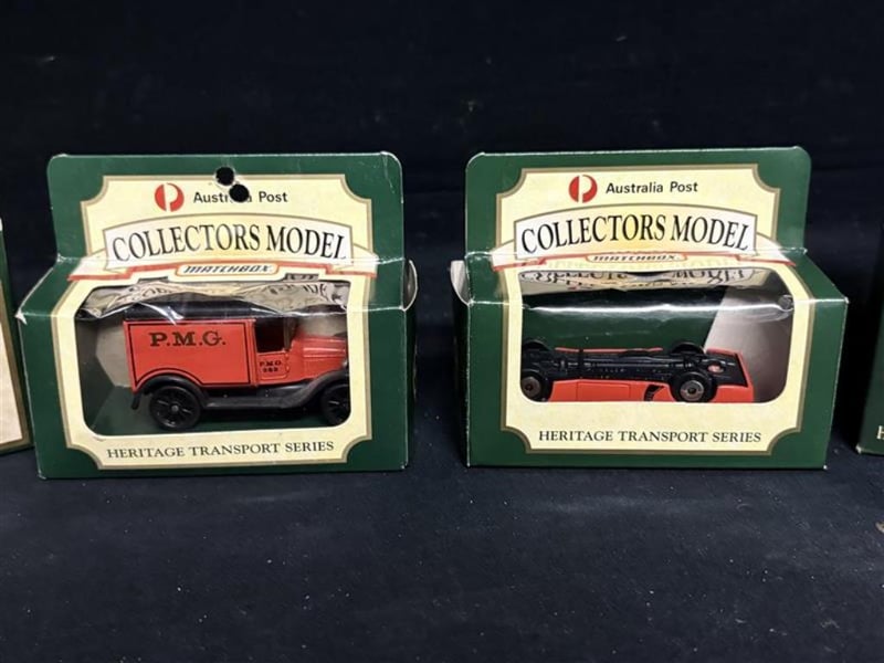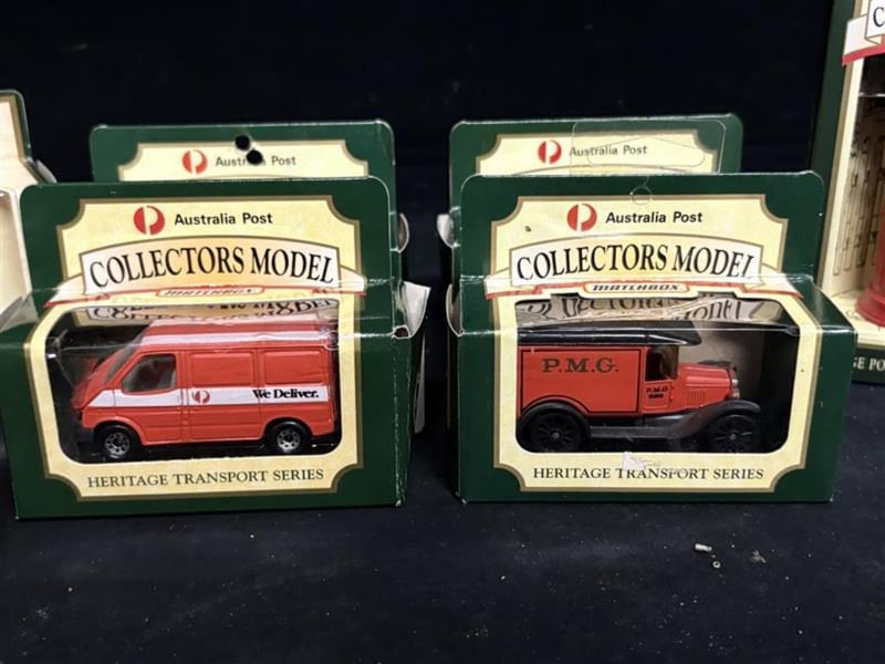 Australia Post Collectors Matchbox and Tomica Diecast Model CarsIncludes Heritage Transport Series and Heritage Posting Box SeriesNo. 2 PMG ScooterNo. 4 PMG Model T FordNo. 3 PMG FJ HoldenNo. 4 PMG Model T FordNo. 6 Parcel Post VanNo. 1 PMG Pushbike1926 Dennis Delivery Van1926 Bullnose Morris VanNo. 2 South Australia Posting Box Type 5