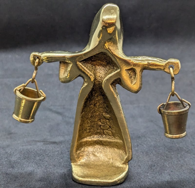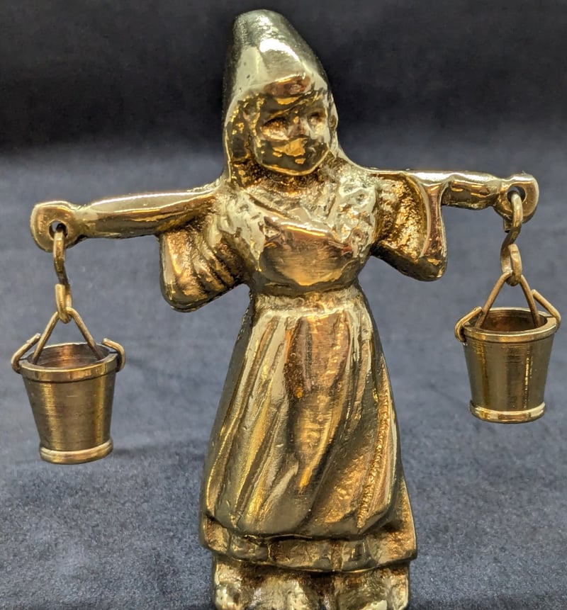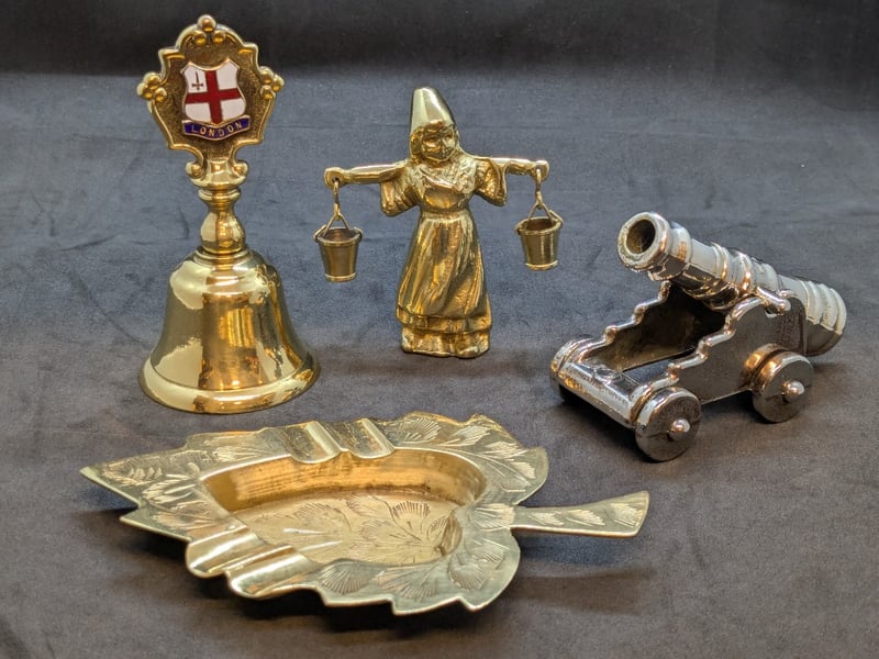 Includes Decorative Brass Cannon Model, Milkmaid Figurine With Pails On A Yoke, Brass Bell London Souvenir, Leaf Shaped Trinket Dish