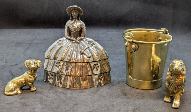 Includes Crinoline Ladu Bell, Brass Bucket, Spaniel Dog, And Daschund Shaped Dog