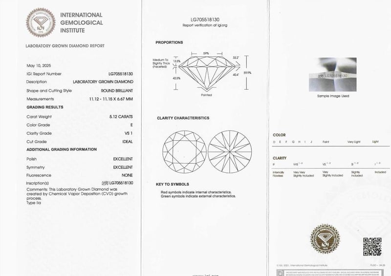 5.12 CARAT ROUND BRILLIANT DIAMOND E/VS1 Igi Certificate # Lg 705518130 Laser Inscribed : Labgrown Igi Lg 705518130 Cut : Ideal Polish : Excellent Symmetry : Excellent Flourescence : None Type : Cvd Condition: Good - Refer Images 0488979+9