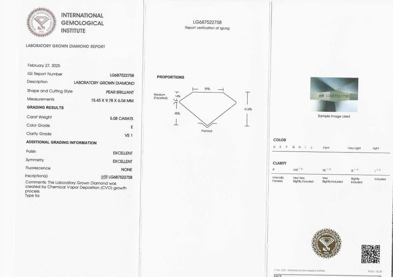 Please note that while all lab grown diamonds listed include certification, the report number or identification may vary upon arrival. This is due to standard manufacturing and batching processes. However, the diamond’s specifications — including carat, color, cut, and clarity — will match or may even exceed those advertised.