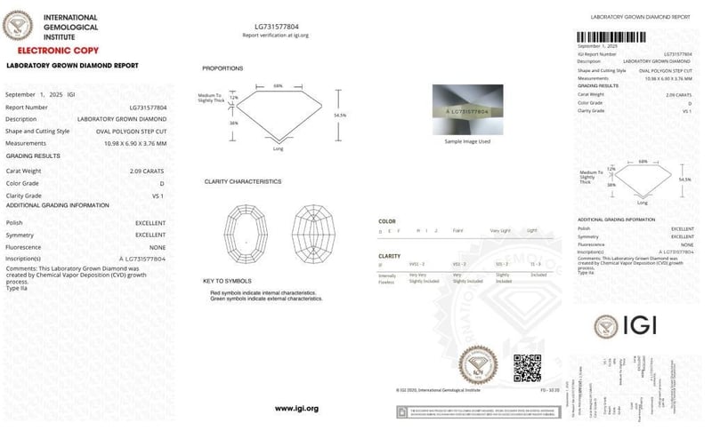 2.09 CARAT STEP CUT OVAL SHAPE DIAMOND D/VS1 Igi Certificate # Lg 731577804 Laser Inscribed : Labgrown Igi Lg731577804 Polish : Excellent Symmetry : Excellent Flourescence : None Type : Cvd Condition: Good - Refer Images 0488979+52