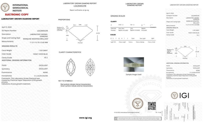 1.50 CARAT MARQUISE CUT DIAMOND FANCY VIVID BLUE /VS2 Igi Certificate # Lg 628406298 Laser Inscribed : Labgrown Igi Lg 628406298 Polish : Excellent Symmetry : Excellent Flourescence : None Type : Cvd Condition: Good - Refer Images 0488979+43