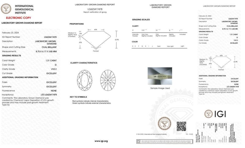 1.31 CARAT OVAL SHAPE DIAMOND G/VVS2 Igi Certificate # Lg 623417478 Laser Inscribed : Labgrown Igi Lg 623417478 Cut : Excellent Polish : Excellent Symmetry : Excellent Flourescence : None Type : Cvd Condition: Good - Refer Images 0488979+1