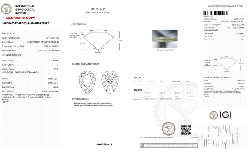 1.21 CARAT PEAR SHAPE DIAMOND D/VS1 Igi Certificate # 710539486 Laser Inscribed : Labgrown Igi 710539486 Polish : Excellent Symmetry : Excellent Flourescence : None Type : Cvd Condition: Good - Refer Images 0488979+12