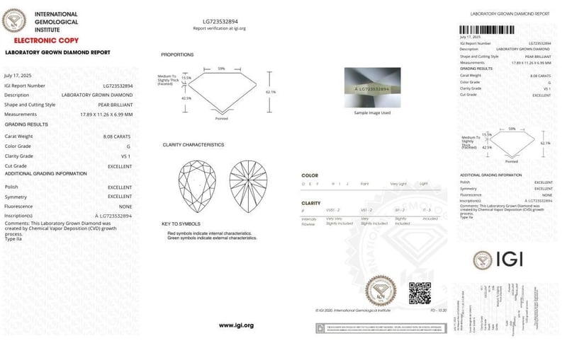 8.08 PEAR SHAPED DIAMOND G/VS1Igi Certificate # Lg 723532894Laser Inscribed : Labgrown Igi Lg 723532894Cut : ExcellentPolish : ExcellentSymmetry : ExcellentFlourescence : NoneType : Cvd Condition: Good - Refer Images 0488552+55