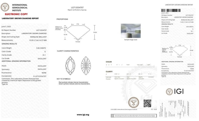 3.06 MARQUISE SHAPED DIAMOND G/VS1Igi Certificate # Lg 713554707Laser Inscribed : Labgrown Igi Lg 713554707Cut : ExcellentPolish : ExcellentSymmetry : ExcellentFlourescence : NoneType : Cvd Condition: Good - Refer Images 0488552+3