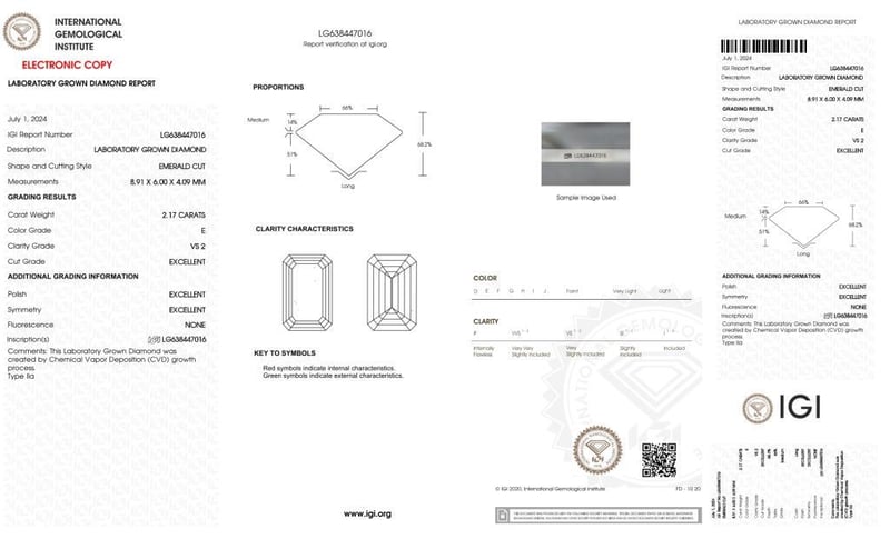 2.17 CARAT EMERALD CUT DIAMOND E/VS2 Igi Certificate # Lg 638447016Laser Inscribed : Labgrown Igi Lg 638447016Cut : ExcellentPolish : ExcellentSymmetry : ExcellentFlourescence : NoneType : Cvd Condition: Good - Refer Images 0488552+17