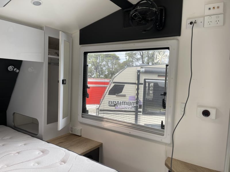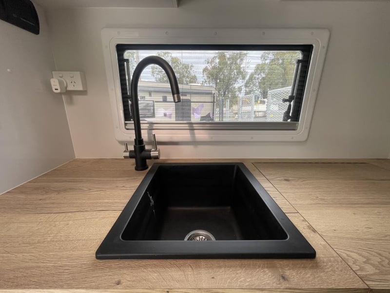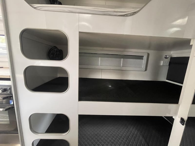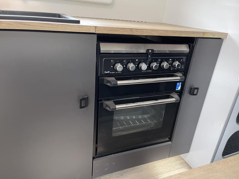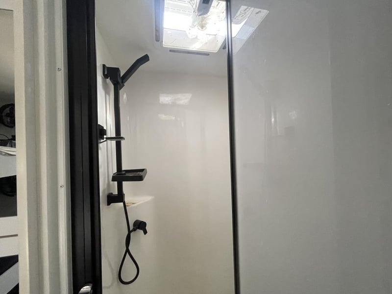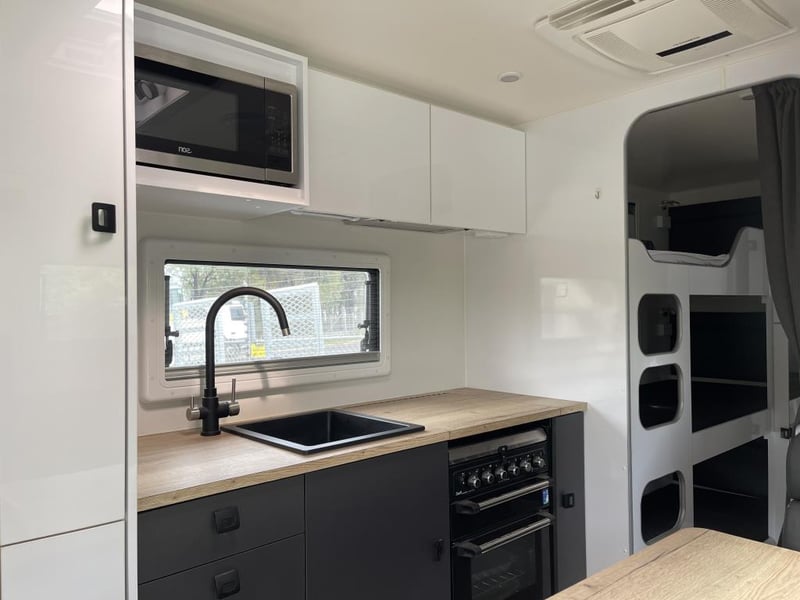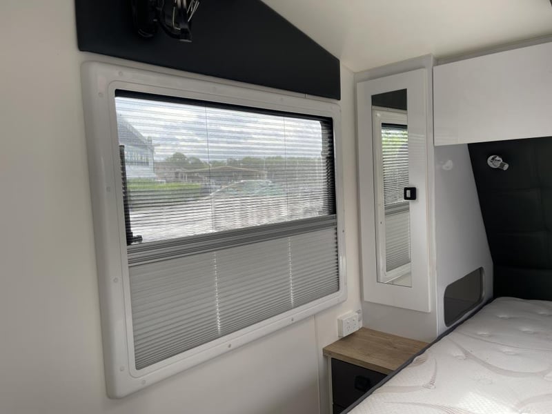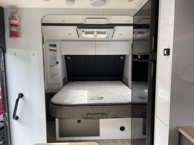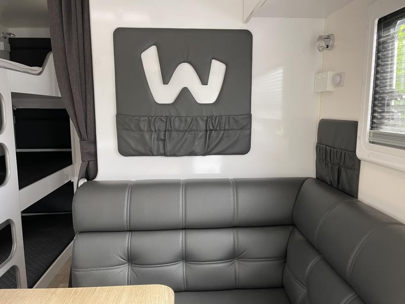 This caravan’s design prioritises convenience and social interaction, with a straight door-side kitchen for engaging meal preparations and a space-efficient open plan bathroom, making it an ideal choice for families or groups who appreciate both style and functionality on their travels.