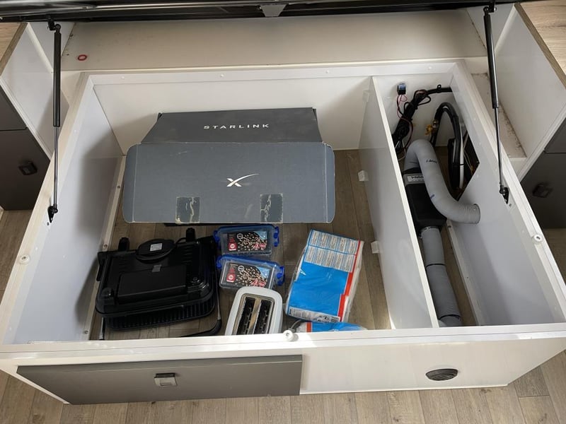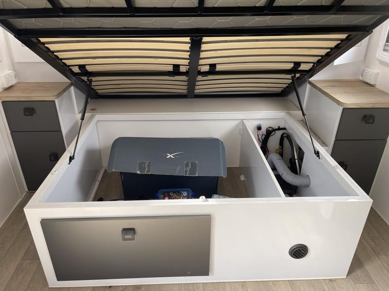 650L under-bed storage (1100W x 450H x 1360D) accessible via gas-lift bed