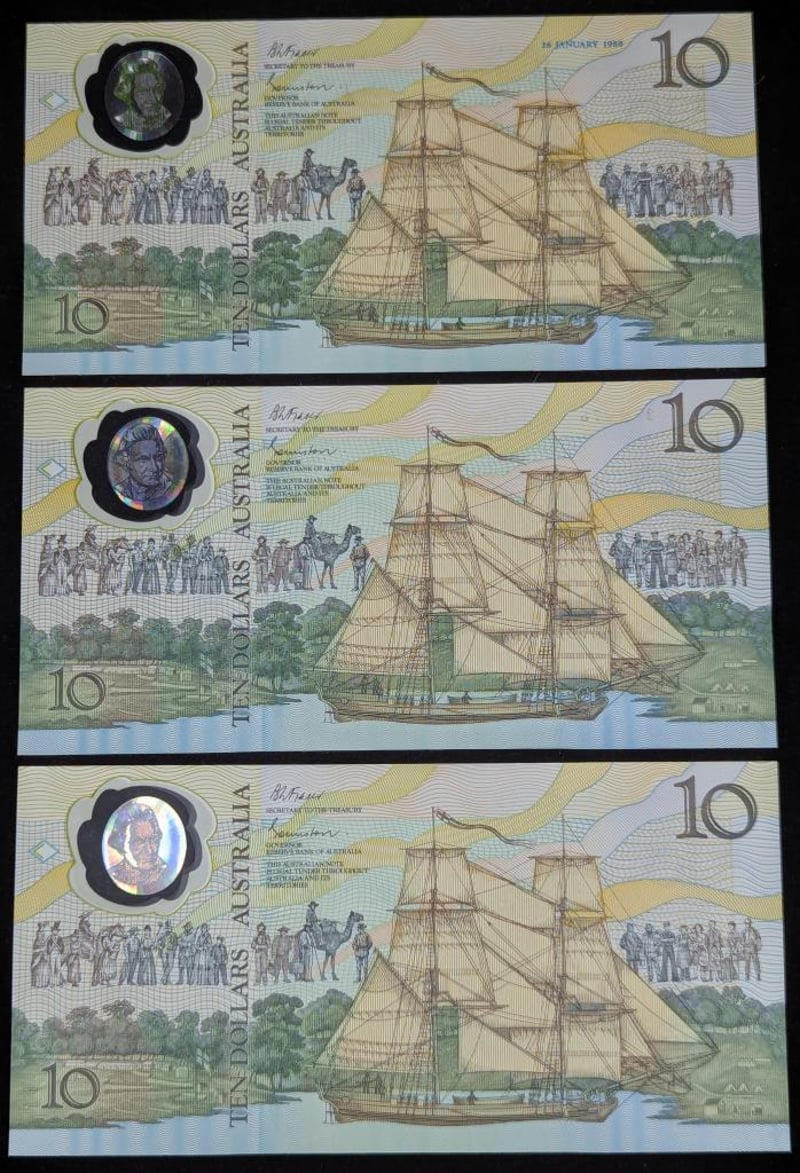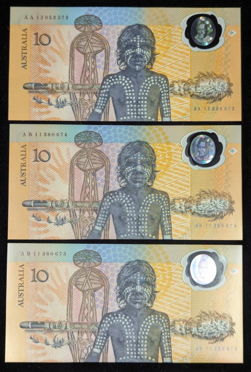 THREE CONSECUTIVE AUSTRALIAN TEN DOLLAR BANKNOTES SIGNED BY FRASER/JOHNSTON, AB 11