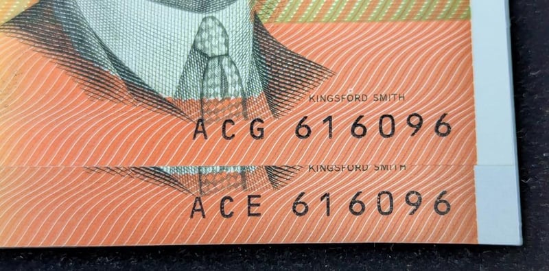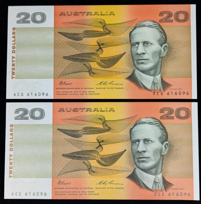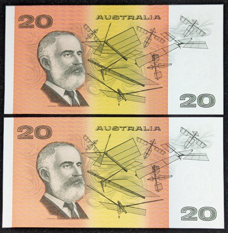 TWO AUSTRALIAN NEAR IDENTICAL SERIES NUMBER TWENTY DOLLAR BANKNOTES