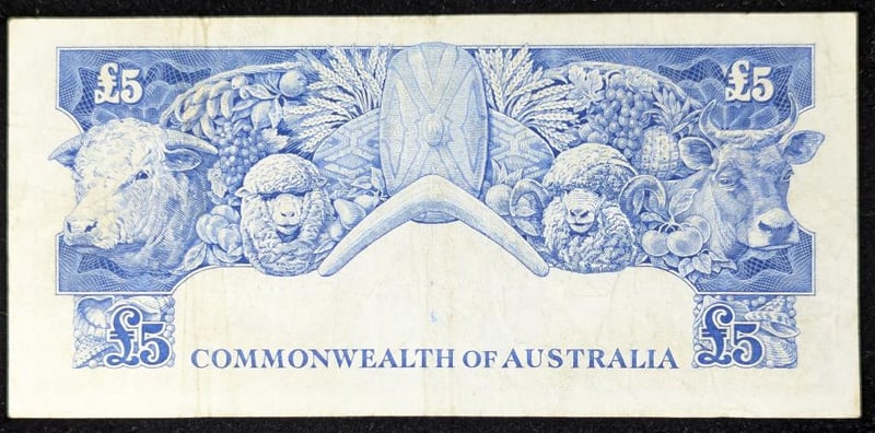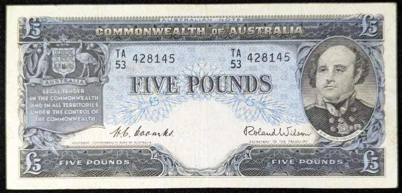 COMMONWEALTH OF AUSTRALIA FIVE POUND BANKNOTE SIGNED BY COOMBS/WILSON, TA 53 Condition: EF587885+27
