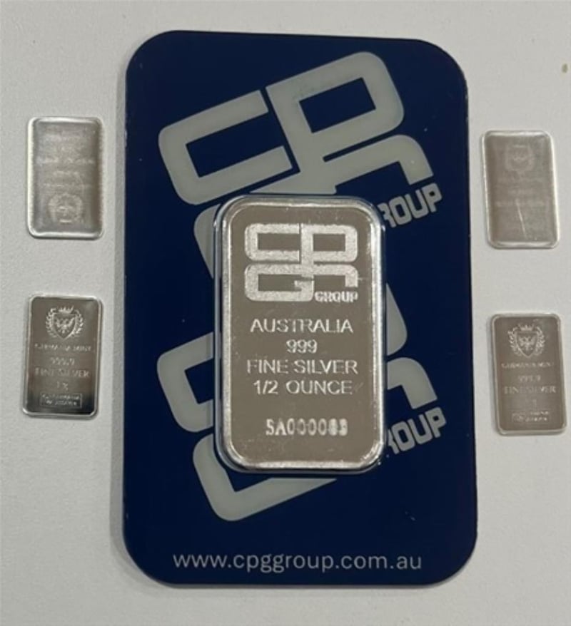 HALF OUNCE CPG SILVER SEALED BAR & 4 X GERMANIA MINT 1G SILVER 311178+23