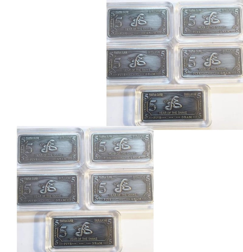 5 X 5 GRAM (25 GRAMS) TIBETAN SILVER ``YEAR OF THE SNAKE`` X 2 5 X 5 Gram (Total Of 25 Grams) Of Tibetan Silver ``Year Of The Snake`` The Ingots Are In Mint Condition Get In Fast While The Bargains Last. Tibetan Silver Is Not Solid Silver It Is Used Primarily In Jewelry Components, And Is Similar To Pewter - It Is An Alloy Of Copper And Sometimes Tin Or Nickel With A Small Percentage Of Pure Silver. Its Overall Appearance Is Of Aged Silver, But Can Be Polished To Provide Highlights On Complex Castings. 311178+43