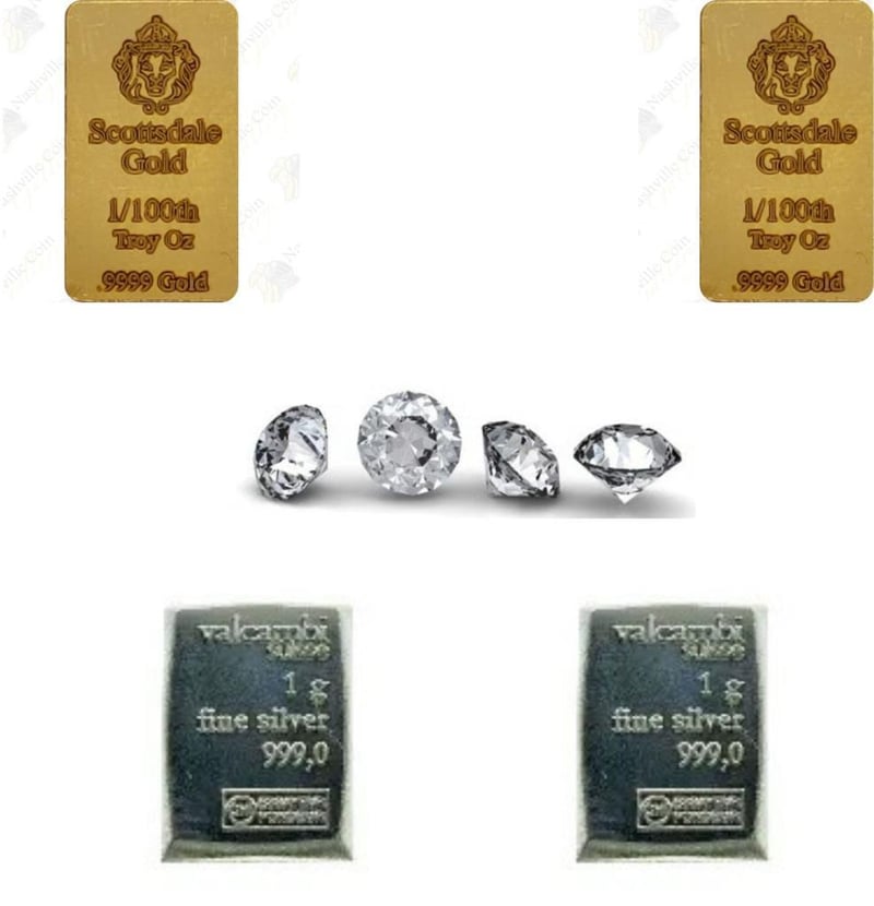 1/100 SCOTTDALE GOLD BAR X 2, 0.14 CARAT FOUR ROUND WHITE DIAMOND & 1 GRAM VALCUMBI SILVER BAR X 2 311178+51