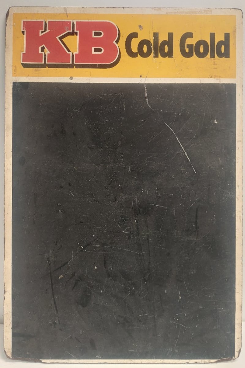 Vintage KB Cold Gold beer advertising sign with chalkboard.