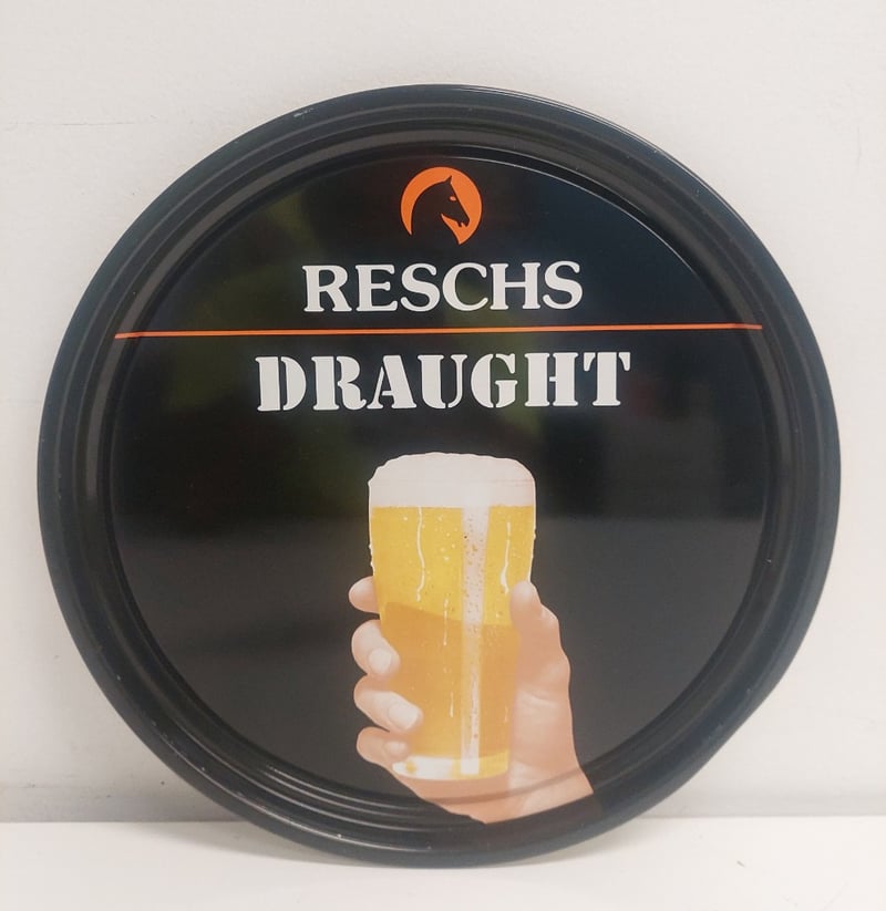 Collectible tin sign or tray featuring the logo for Reschs Draught.