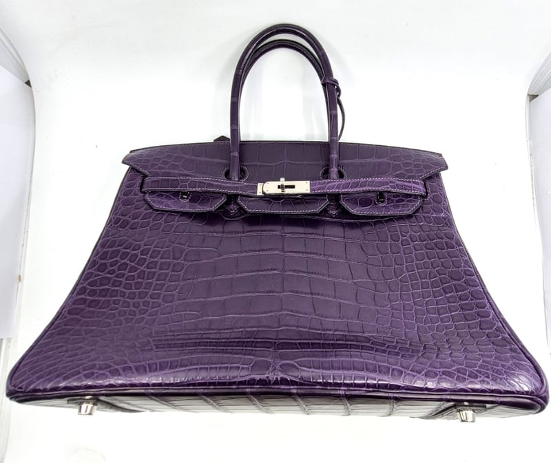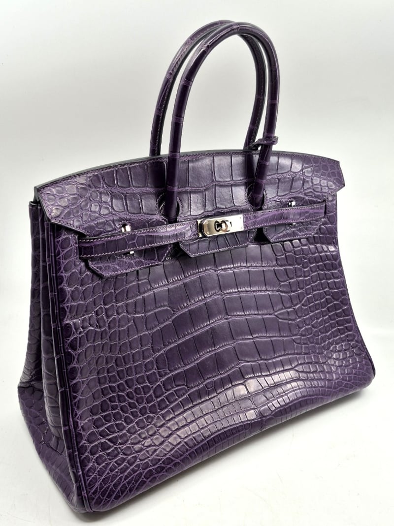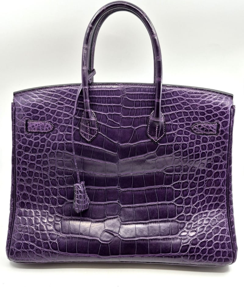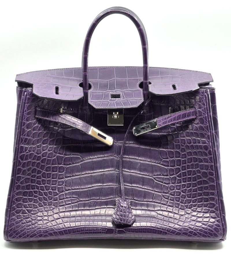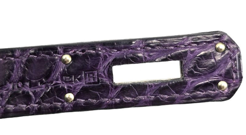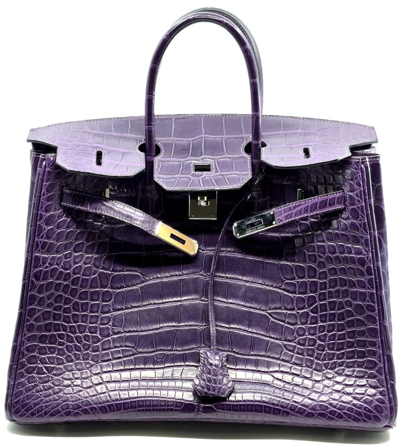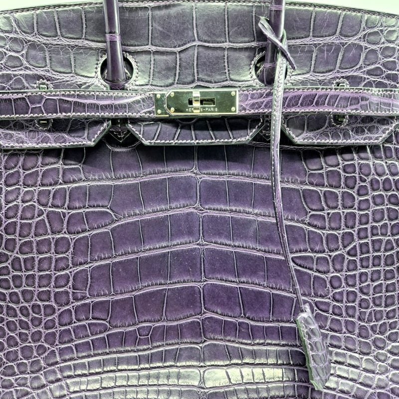 POROSUS CROCODILE COLOURED IN AMETHYST, TURN-LOCK CLOSURE AT FRONT.
