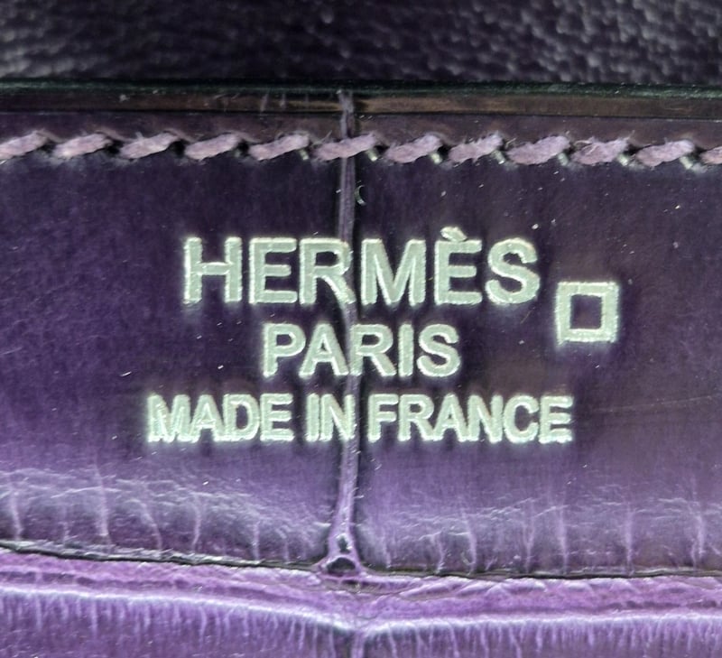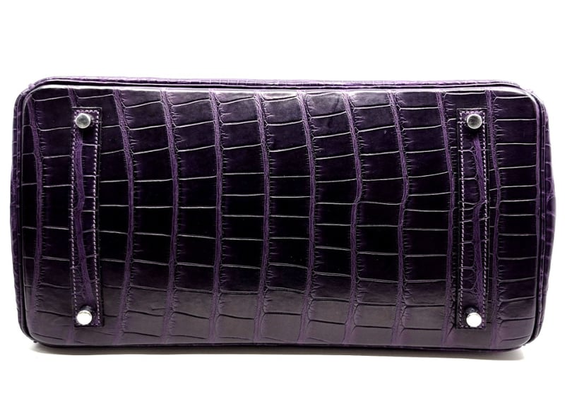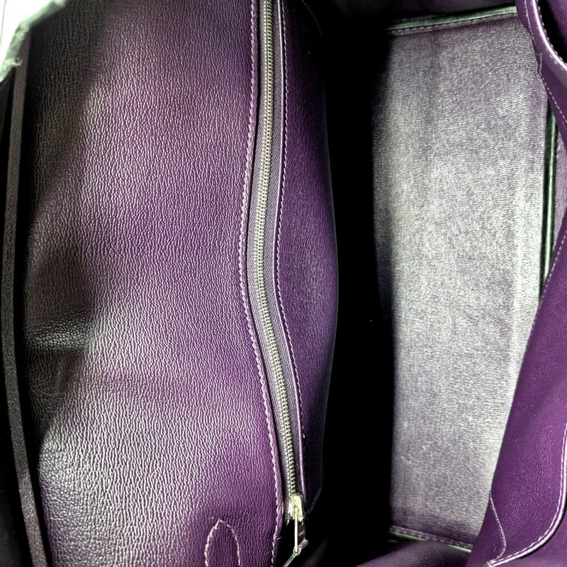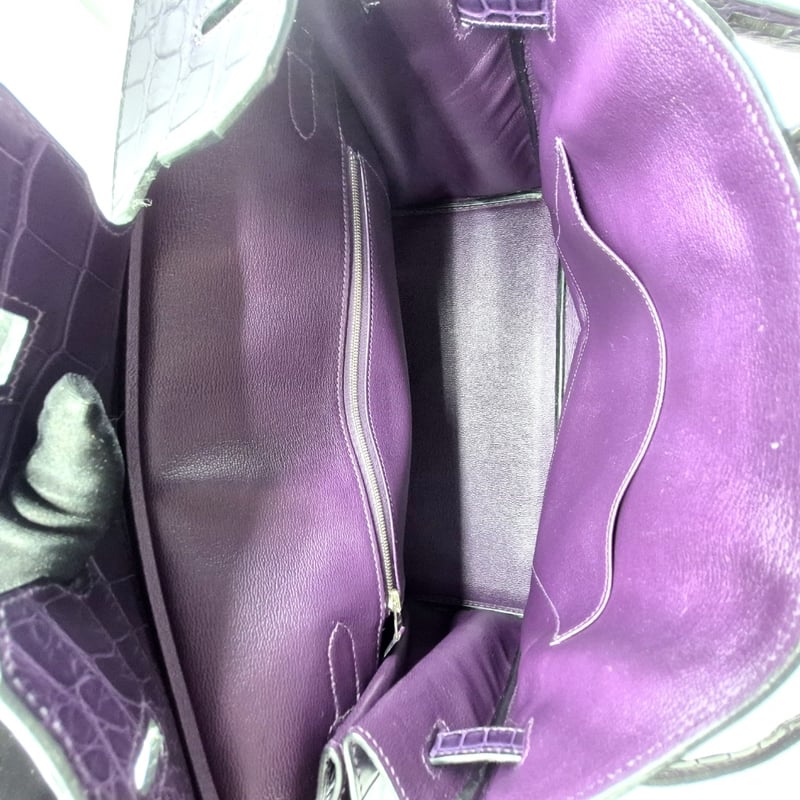 INTERIOR IS LINED WITH AMETHYST CHEVRE LEATHER AND HAS ONE ZIP POCKET WITH A ZIPPER AND AN OPEN POCKET