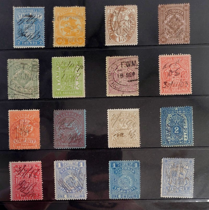 1880S VICTORIA STATE STAMP DUTY COLLECTION INCLUDES £2 BLUE , SIXPENCE FO TWO POUOVD , HAND CANCELS , EXCEPTION EXAMPLES / HIGH VALVE