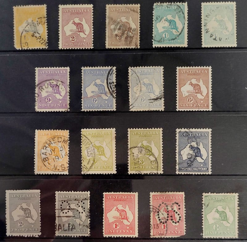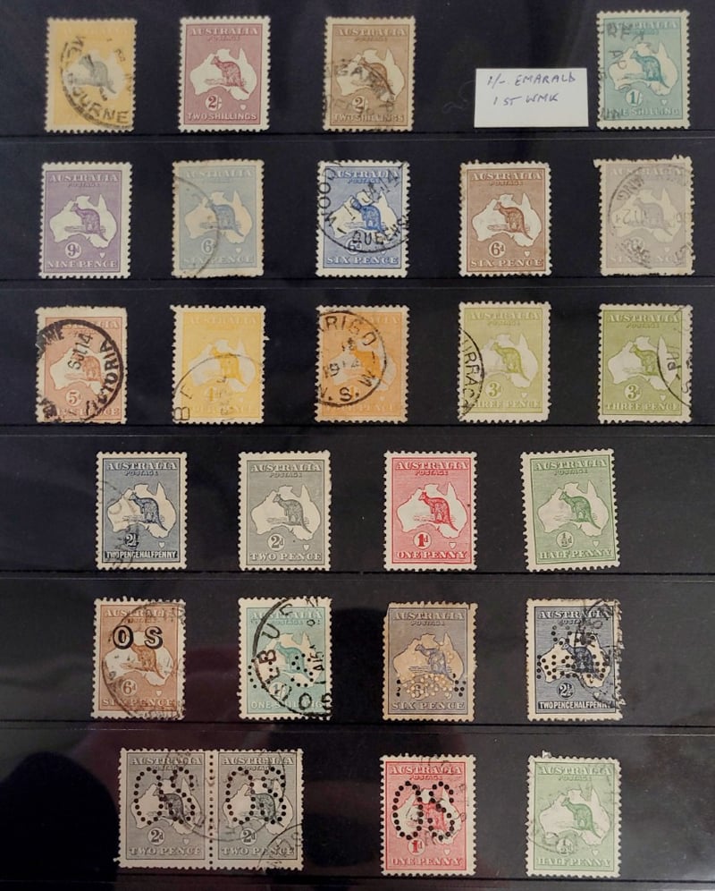 AUSTRALIAN KANGAROO ON MAP COLLECTION INCLUDES MINT / HINGED , HALF PENNY TO FIVE SHILLING , OFFICIAL SERVICE OVERPRINTS AND PERFINS ( MULTIPLES ) AND COLOUR VARIATIONS488458+19