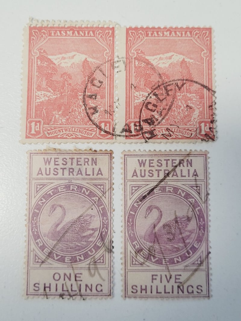 HIGH VALUE TAS / WA SET INCLUDING MAJOR ERRORS PAIRProvenance: 1903-05 Tasmania One Penny Pair, Mount Wellington, Error - Double Perforation ( Top Left Stamp ) , Rare Error 1880 Wa Hugh Value Internal Revenue Five And One Shilling Hand Cancelled488458+55
