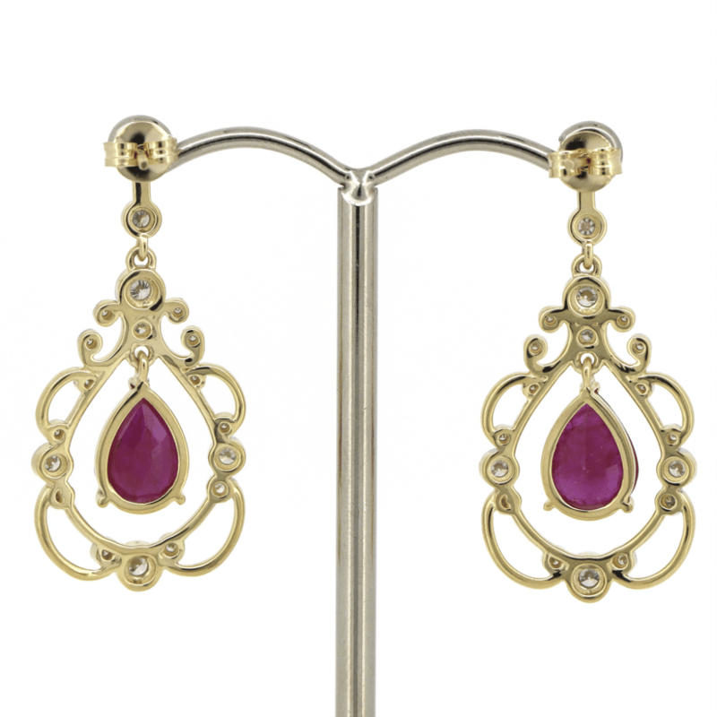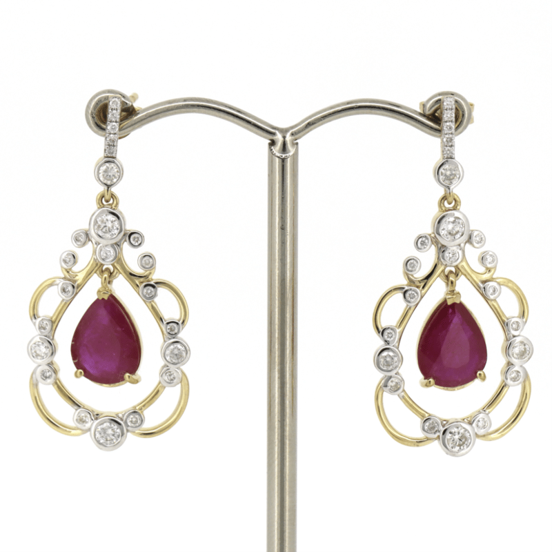 14K YELLOW GOLD/RHODIUM, RUBY AND DIAMOND, DROP EARRINGS. The Design Features, 2 Pear Cut, Moderate Pinkish-Red, Rubies (2.88Ct Tsw, Moderately Included, Enhanced), 3 Claw Set In Yellow Gold. Embellishing The Design Are, 46 Round Brilliant Cut, Diamonds (0.63Ct Tdw, G-H Colour, Si1-Si2 Clarity), Micro-Bead/Bezel Set With Rhodium Plating. The Earrings Have Post Backs With Butterfly Clasps. Valuations Provided by an Independent Third-Party Professional Not Directly Associated With Lloyds Auctions at AUD $$28,000.00This valuation has been conducted by an independent third-party professional. The valuation amount is an assessment by the issuing valuer and does not reflect the auction value of the item. Any inquiries regarding the valuation should be directed to the issuing valuer (refer to contact details on the certificate), as Lloyds Auctions has no affiliation or influence over the valuation, the valuer, or the stated amount. Condition: Good - Refer Images 0645944+5207