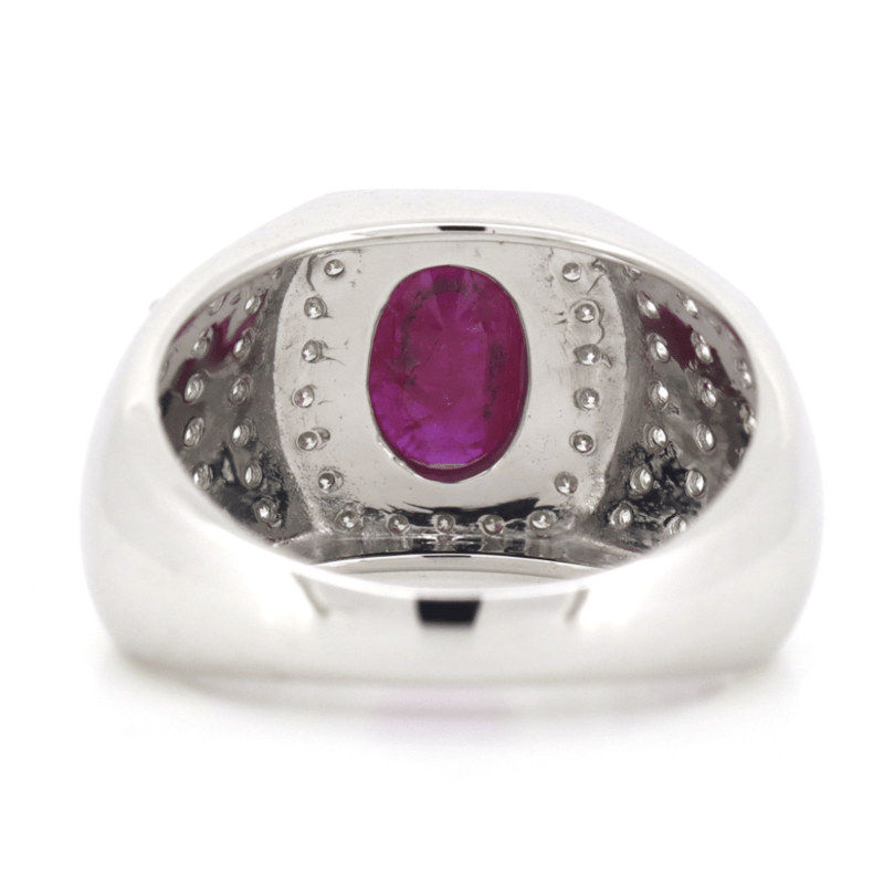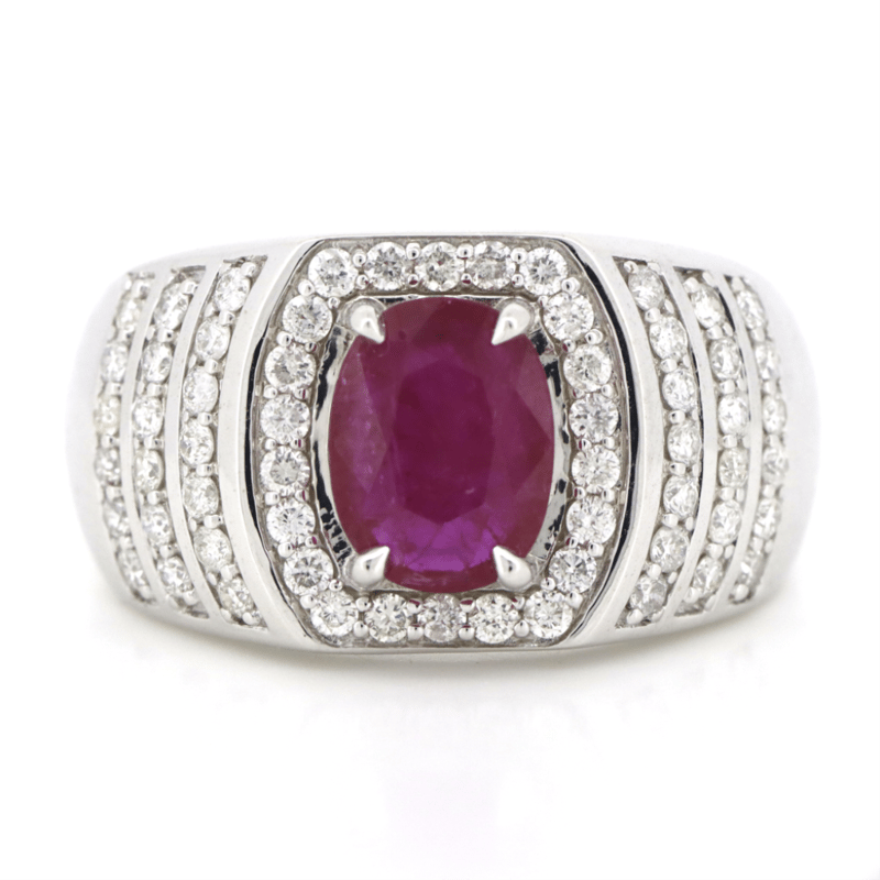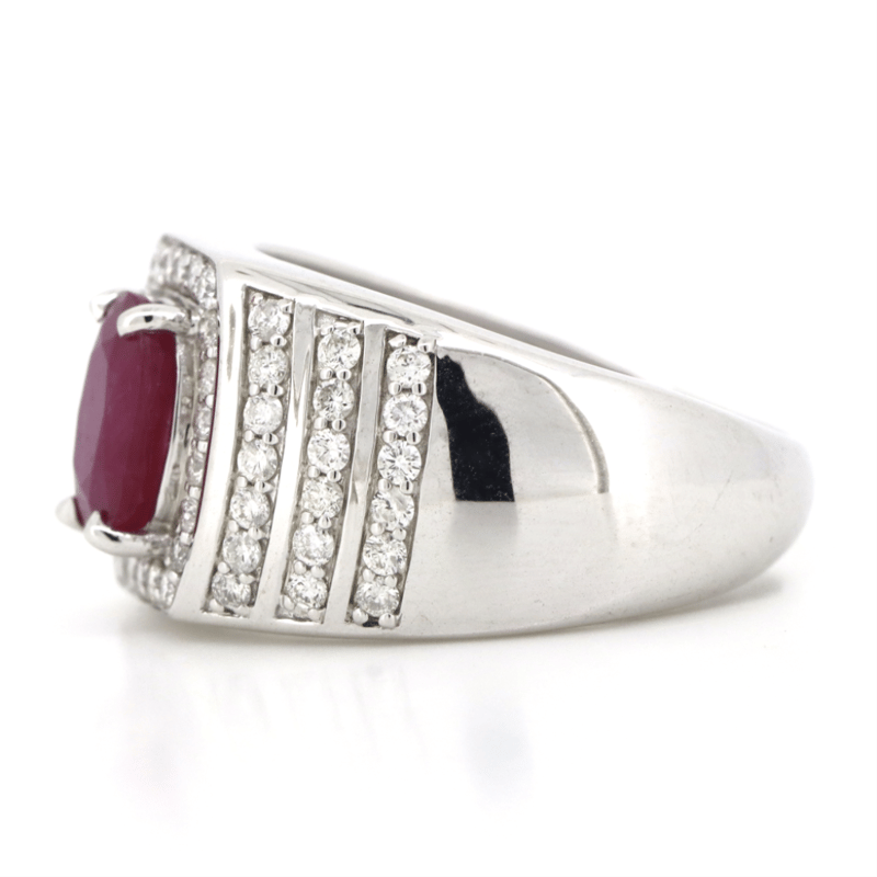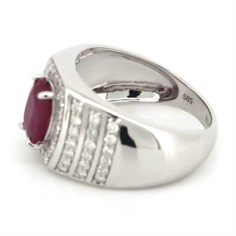 14K WHITE GOLD, RUBY AND DIAMOND, GENTS RING.