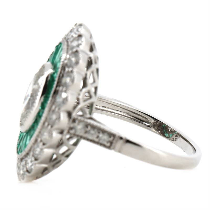 14K WHITE/YELLOW GOLD, 1.16CT COLOMBIAN EMERALD AND DIAMOND, ART DECO INSPIRED RING.