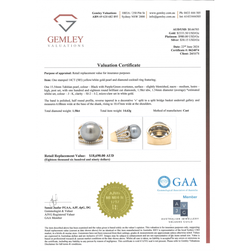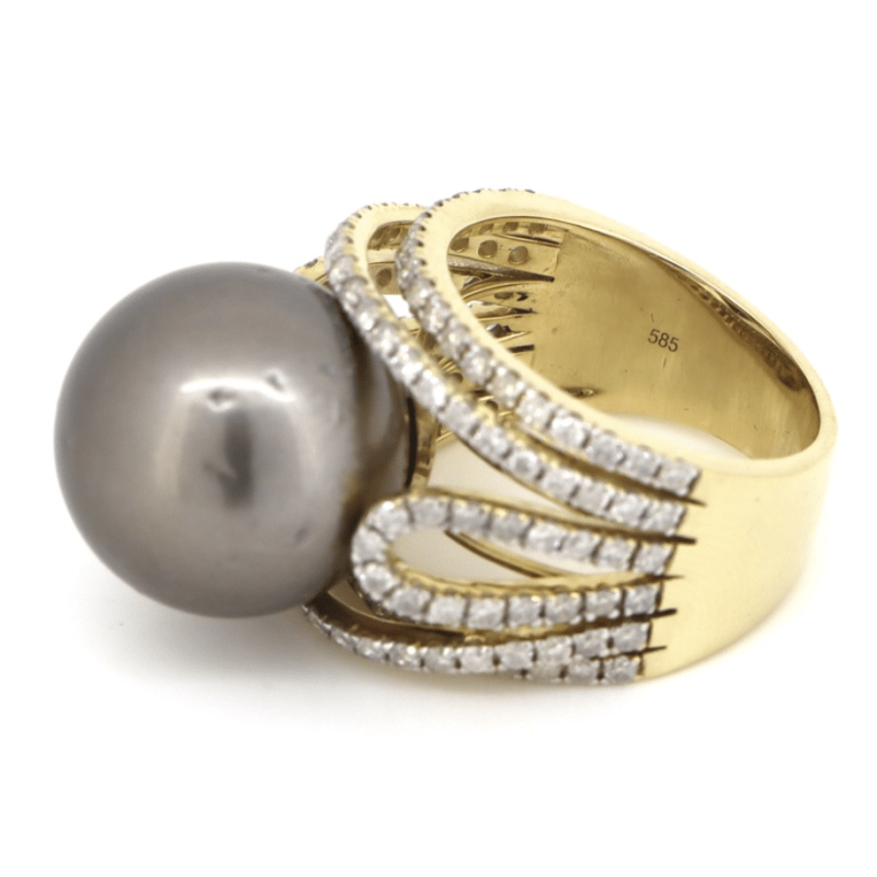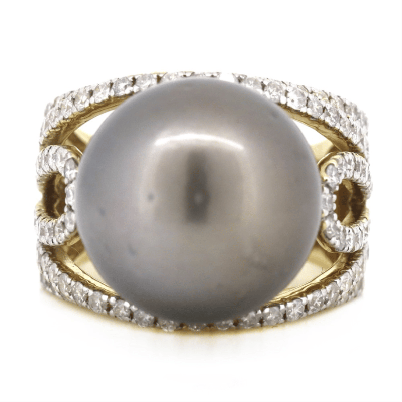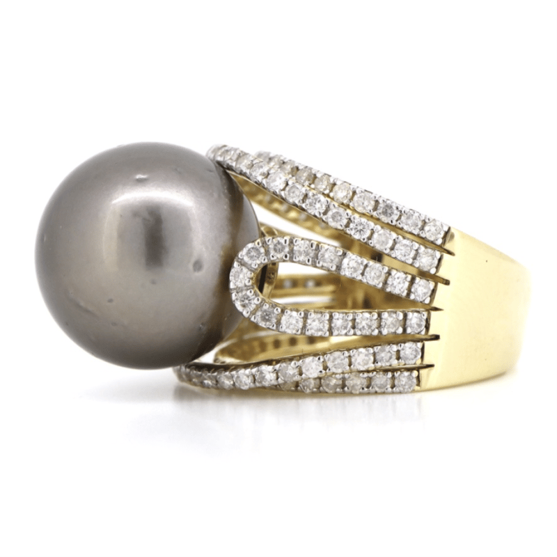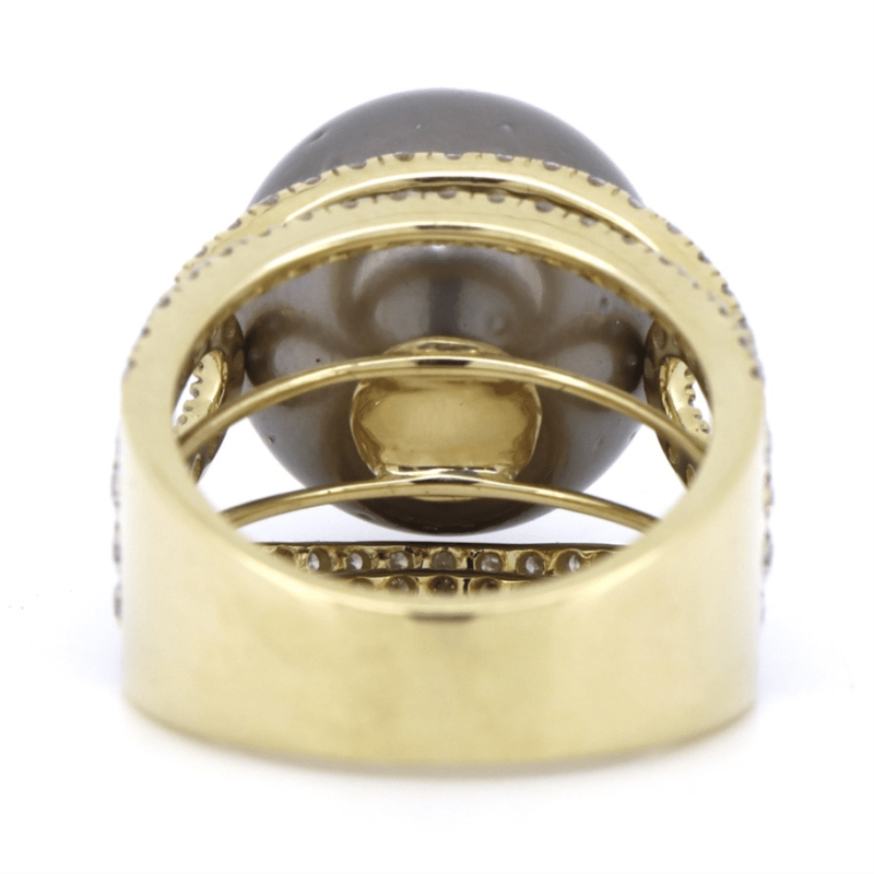 The Centre Features, One Round, Black With Green/Purple Overtones, Cultured Tahitian Pearl (15.54Mm Size, Slightly Blemished, High Lustre). Embellishing The Design Are, 118 Round Brilliant Cut, Diamonds (1.58Ct Tdw, J-K Colour, Si2-I2 Clarity), Micro-Claw Set In White Gold. Ring Size O.