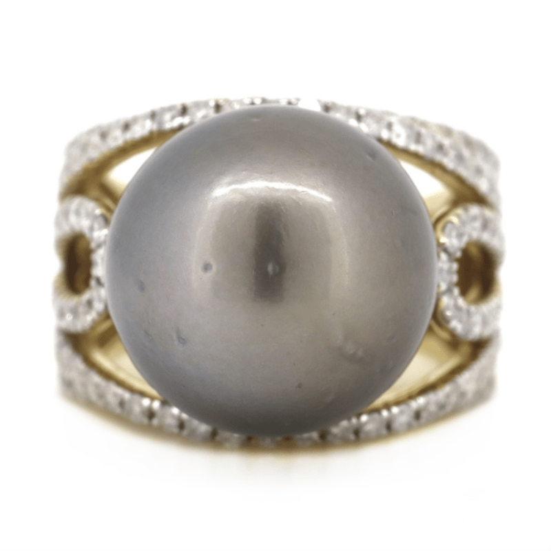 14K YELLOW/WHITE GOLD, BLACK CULTURED TAHITIAN PEARL AND DIAMOND, COCKTAIL RING.